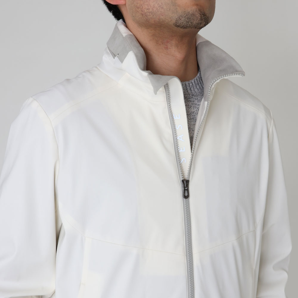 ・オフホワイトという色合いが目を惹くクリーンな色合いのアウターシェル、スタンドカラー周りや袖に用いられたライトグレーのアルカンターラ、それらにトーンを合わせたジップといった配色が機能的なジャケットに洗練されたムードをもたらします。