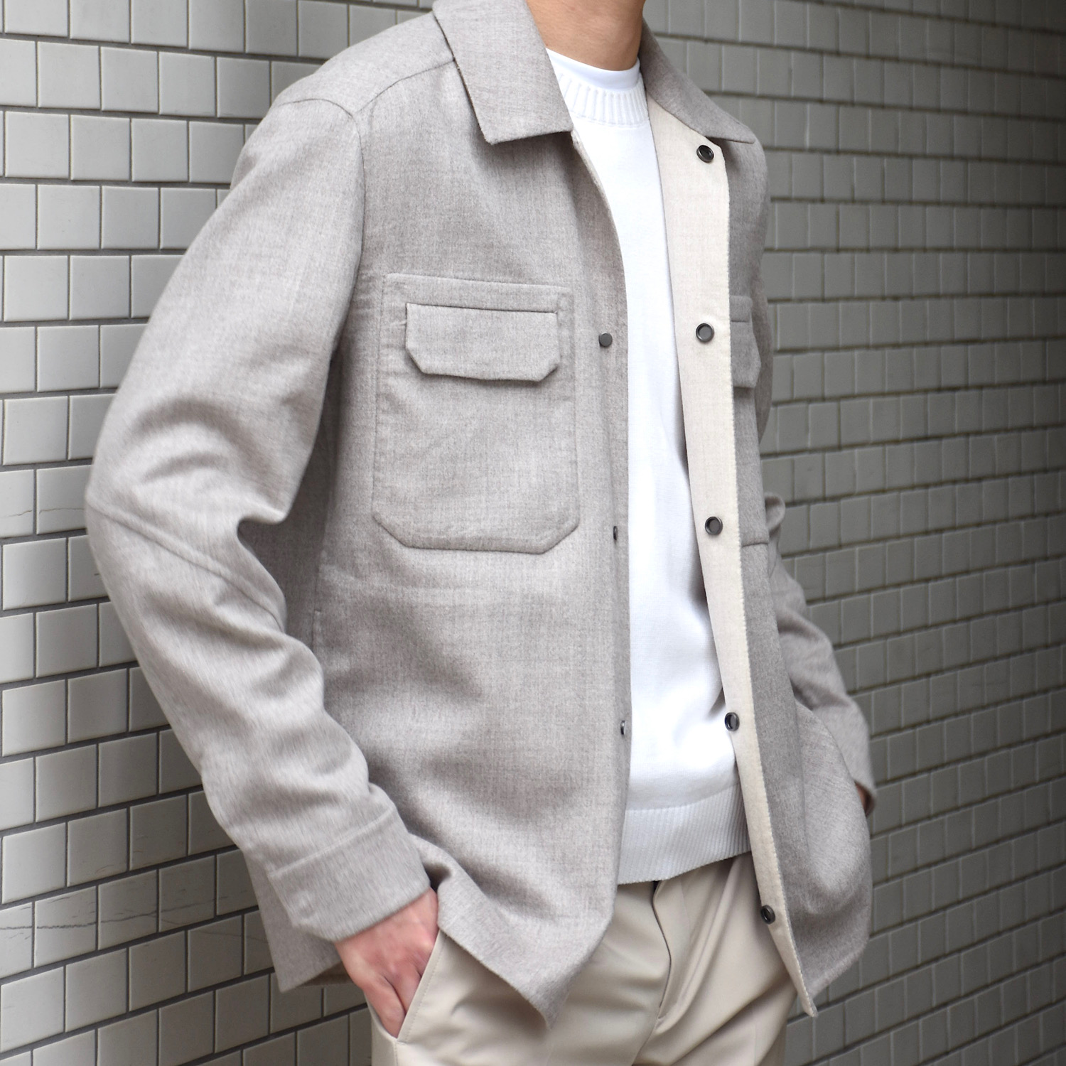 ・ロロ・ピアーナ兄弟が手掛けるだけあり、そのDNAを存分に感じさせる高品質なダブルフェイスウールは、表グレージュ×裏ベージュというトーンオントーンの配色が実にエレガント。