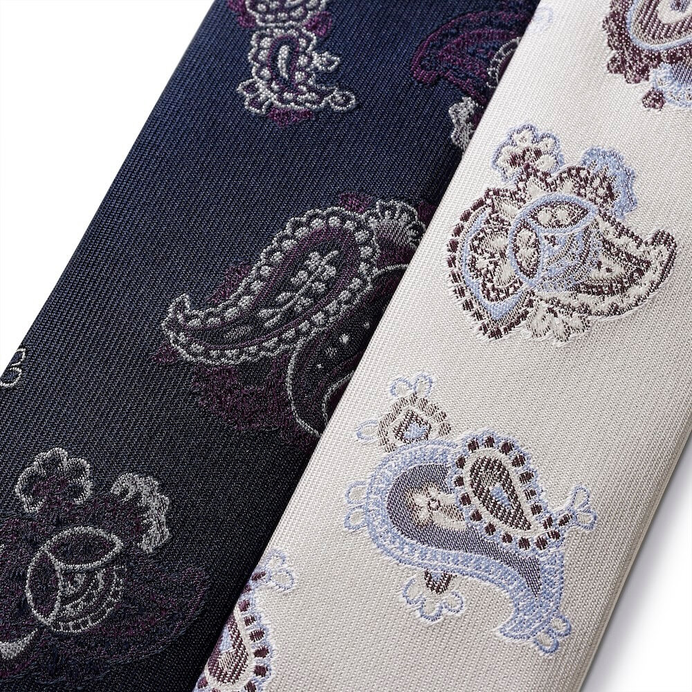 ネイビーにはパープル、シルバーにはサックスブルーを合わせた配色で、伝統柄に“色気”が加わっています。首元に心地よくフィットし、長時間着用しても疲れにくいのが魅力。結びやすく型崩れしにくいため、ノットもきれいに決まります。