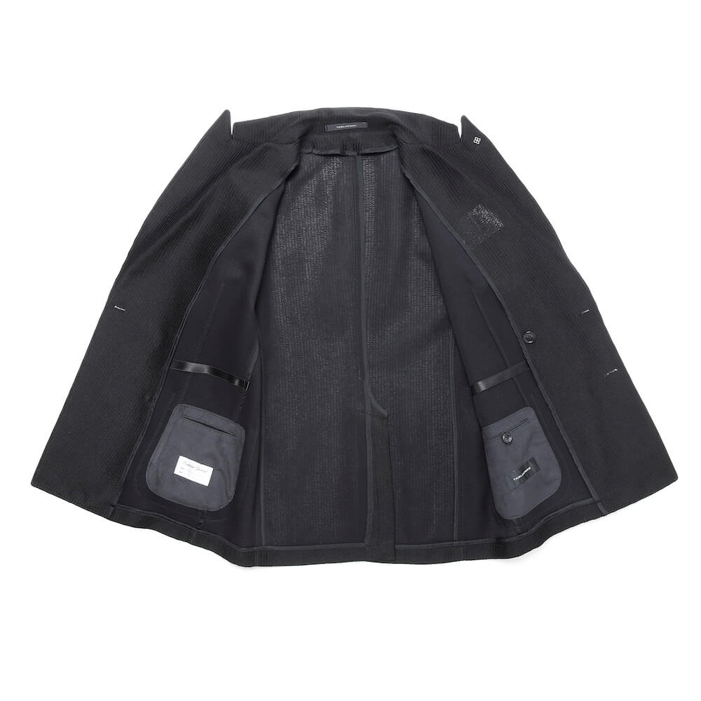 形状保持と立体感、そし着心地を良くするためにジャケットのキモとも言える襟と(前身頃の)見返し以外は一枚仕立て。裏地と胸ポケットを省き、筒袖が採用されています。袖丈が合えば、お直し無しで着られるお手軽な一着。極めて軽く柔らかな着心地が特徴です。