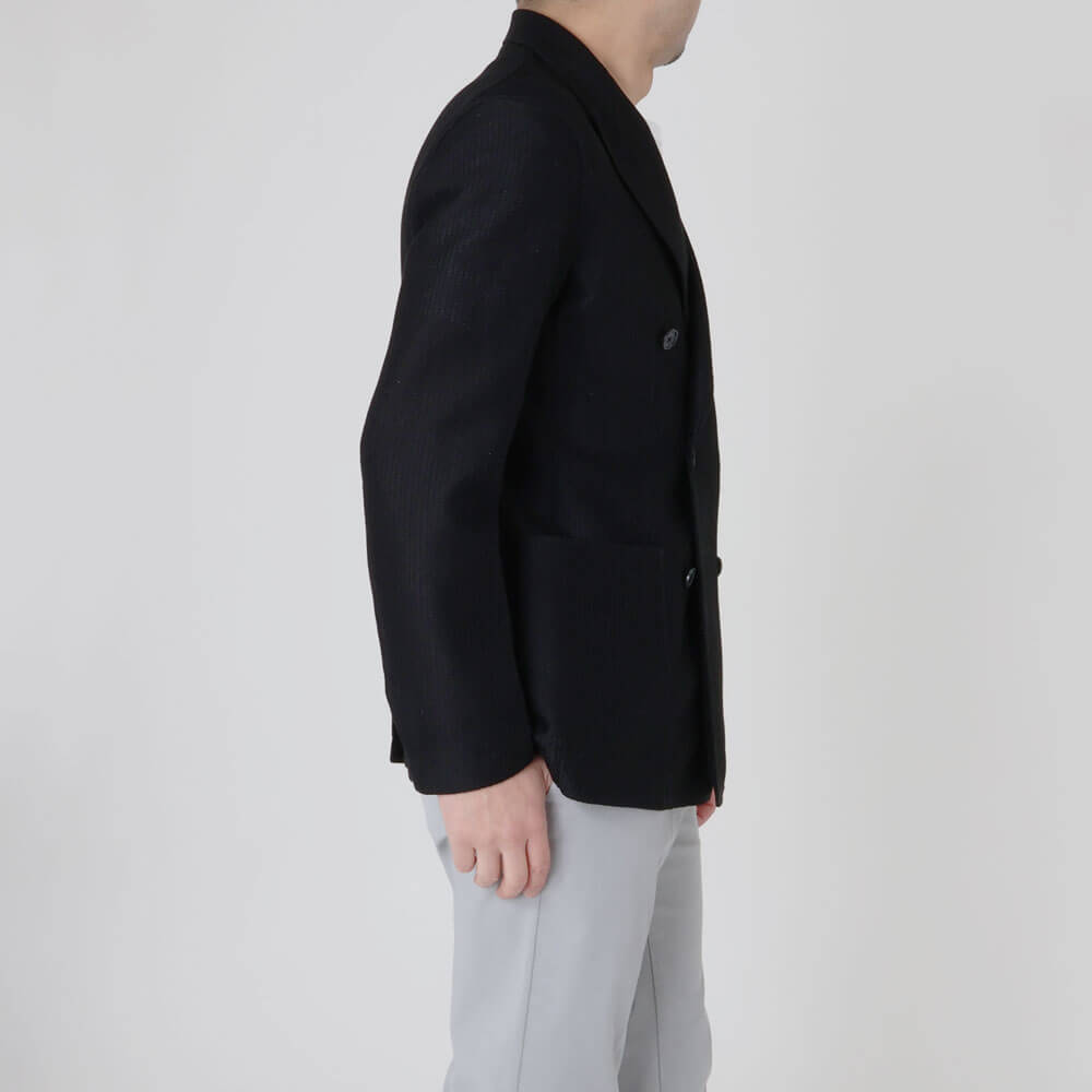 • 見返しあり(前身頃)、背・袖裏地なし、筒袖ステッチあり、センターベント、パッチポケット2つ、内ポケット2つ