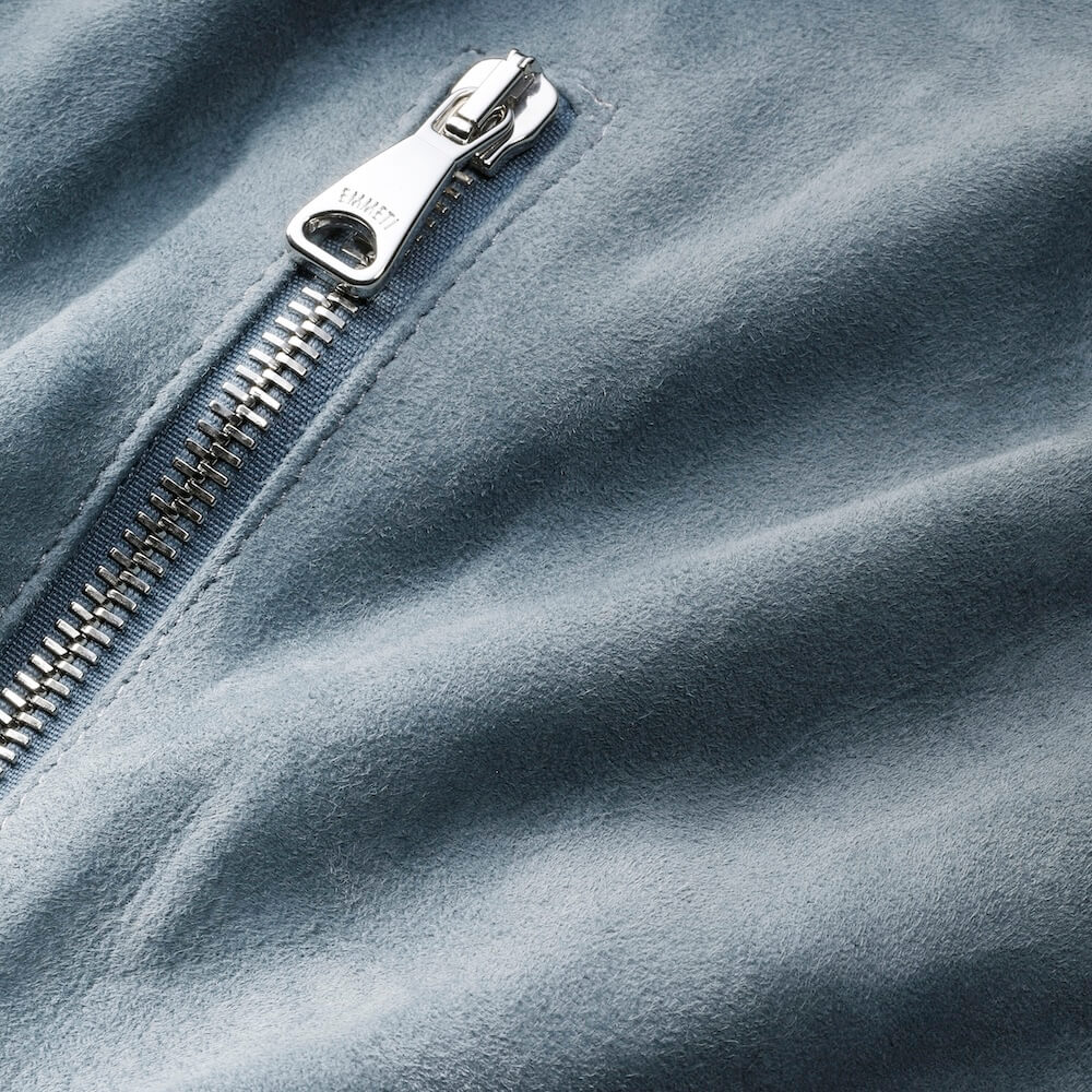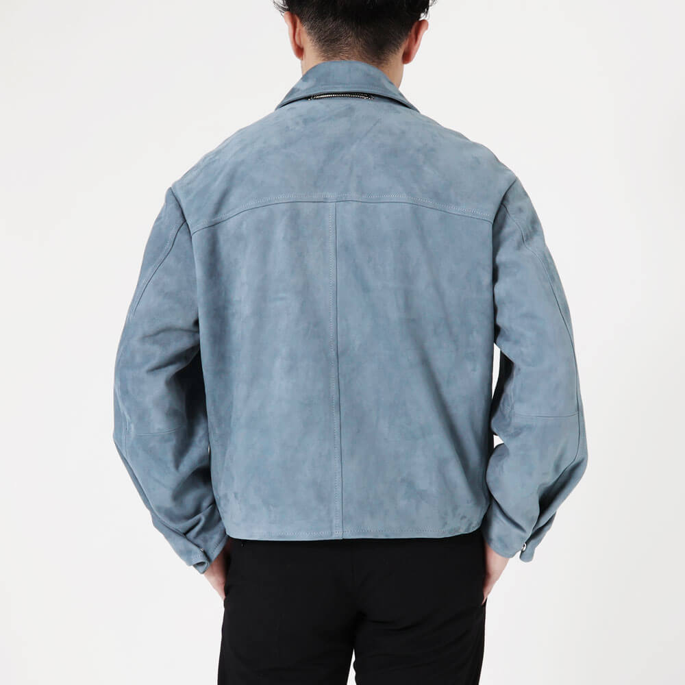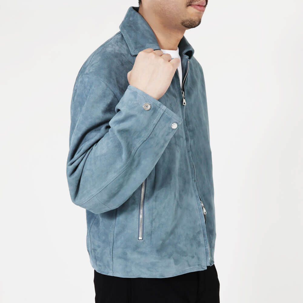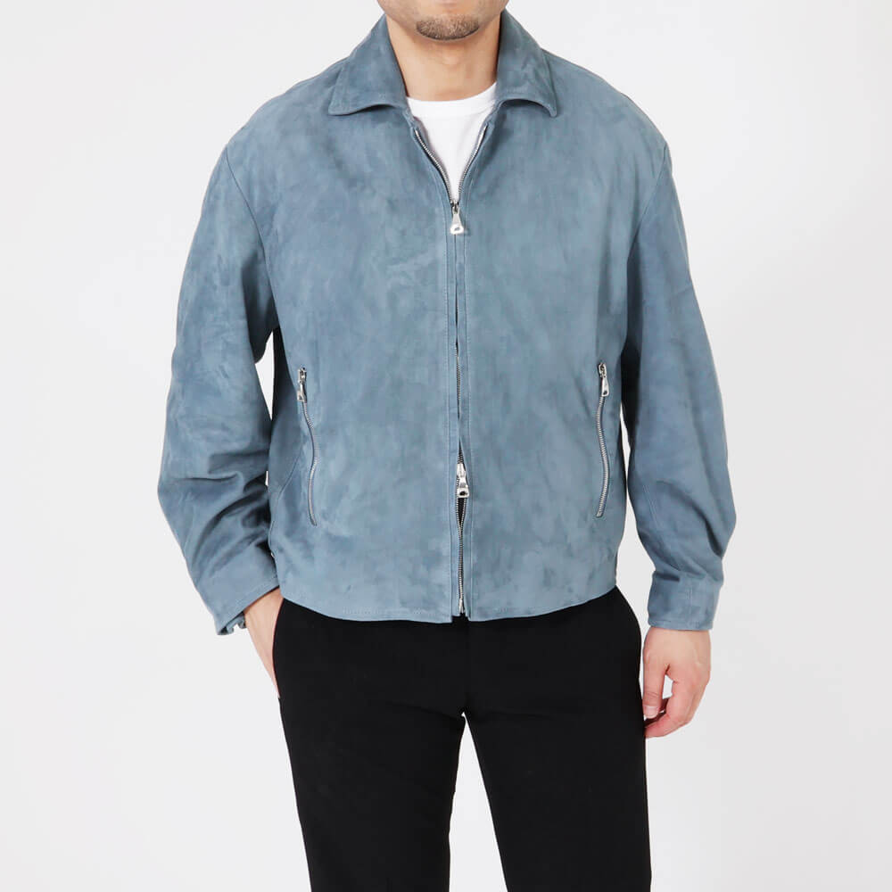 肩がドロップした丸みのあるフォルムに、着丈はあえて短めに設定。袖口はスナップボタン仕様で、シルエットに強弱をつけられるデザインです。オーバーサイズではなく、程よいメリハリが効いたバランスで、大人の色気を感じさせるのがこのブルゾンの魅力。スウェードの質感も非常にソフトで、見た目から上質さが伝わります。カットソーやニットの上から44サイズを着用し、ちょうど良いサイズ感でした。