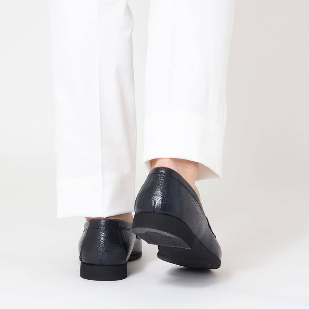 ・シュリンクレザーと甲部分のスウェードのカラートーンを合わせることで、メリハリを効かせつつ、ネイビー系で上品な印象に。ソールはブラックです。