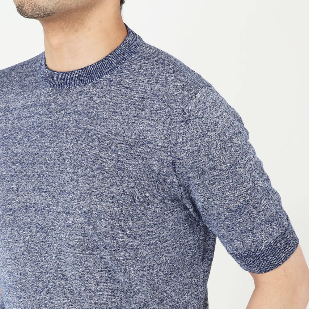 ・表はリネンの清涼感が際立つメランジ調、裏は肌当たりが良いように滑らかに編み立てられており、ハイゲージながら薄過ぎない編み地です。