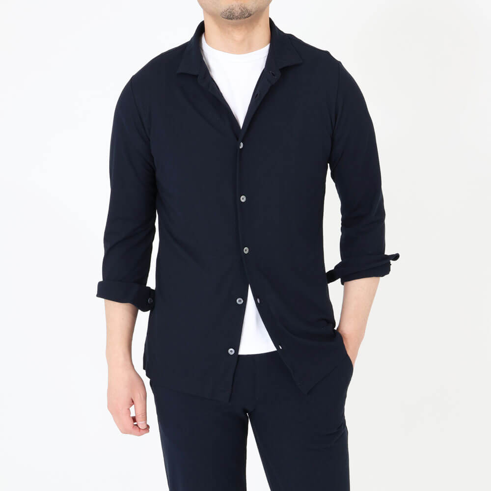 ・布帛のシャツのように、そして羽織物として着られるのがジャージーシャツの便利なところ。リラックス感があり仕事や移動時にもピッタリです。ベーシックな3色でご用意しました。ネイビーのみセットアップとして穿けるパンツもラインナップ。