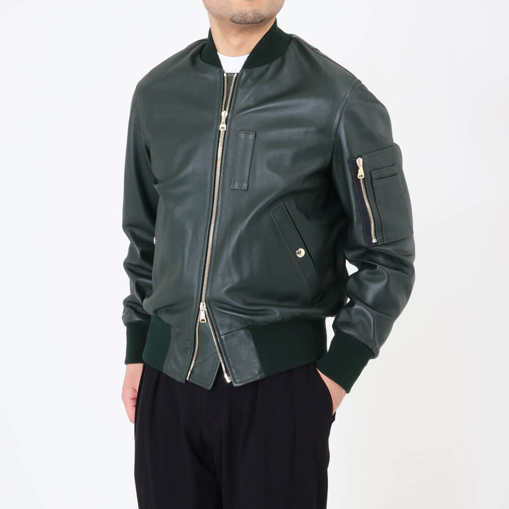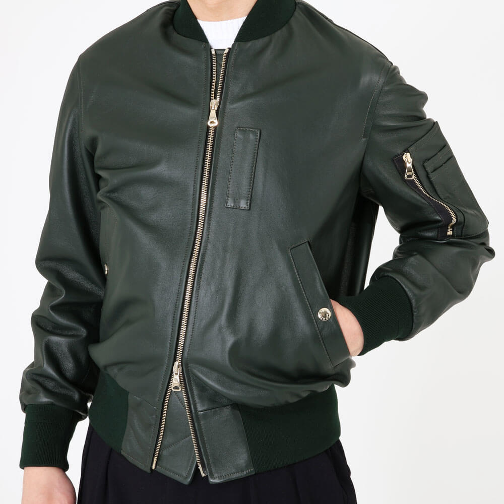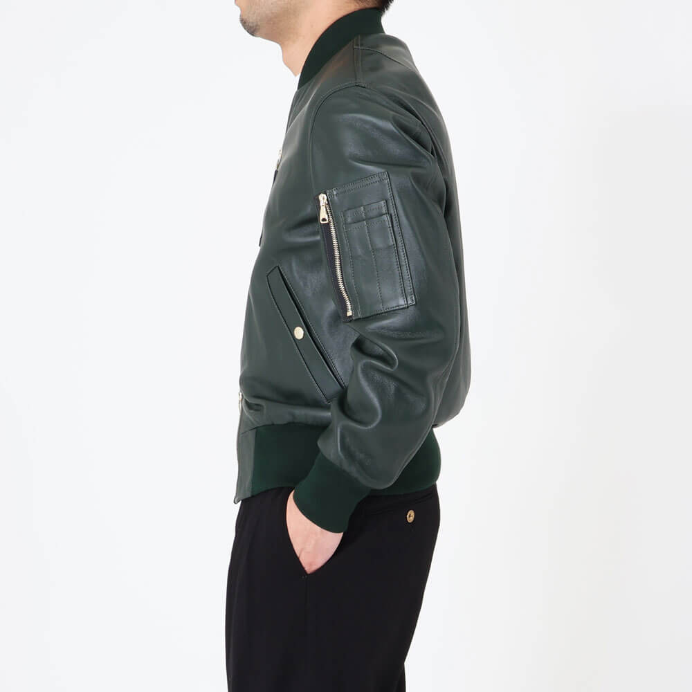 ・MA-1の代表的なディテール、シガレットポケット、風の侵入を防ぐ前立てなどは踏襲しつつ、素材が高品質レザーになるだけで雰囲気がグッとラグジュアリーに。