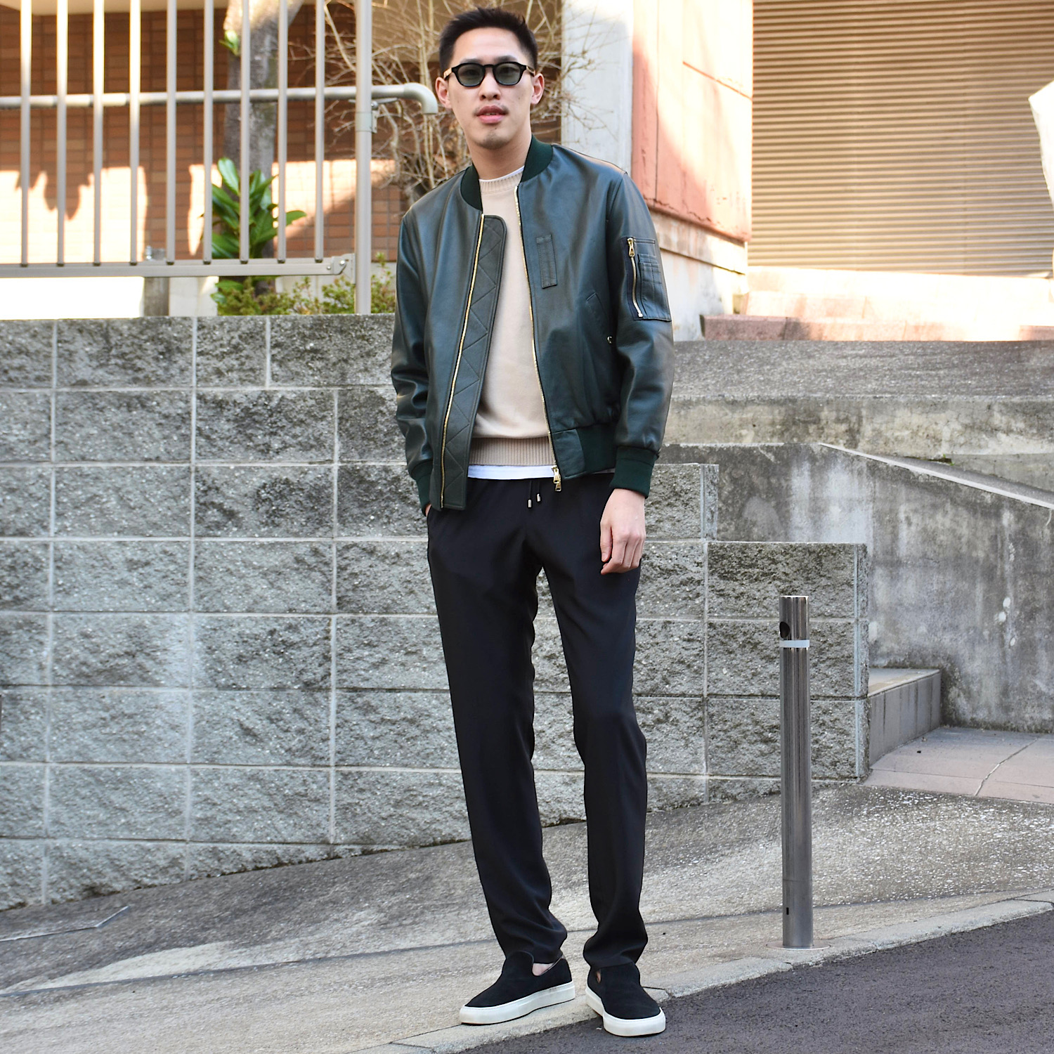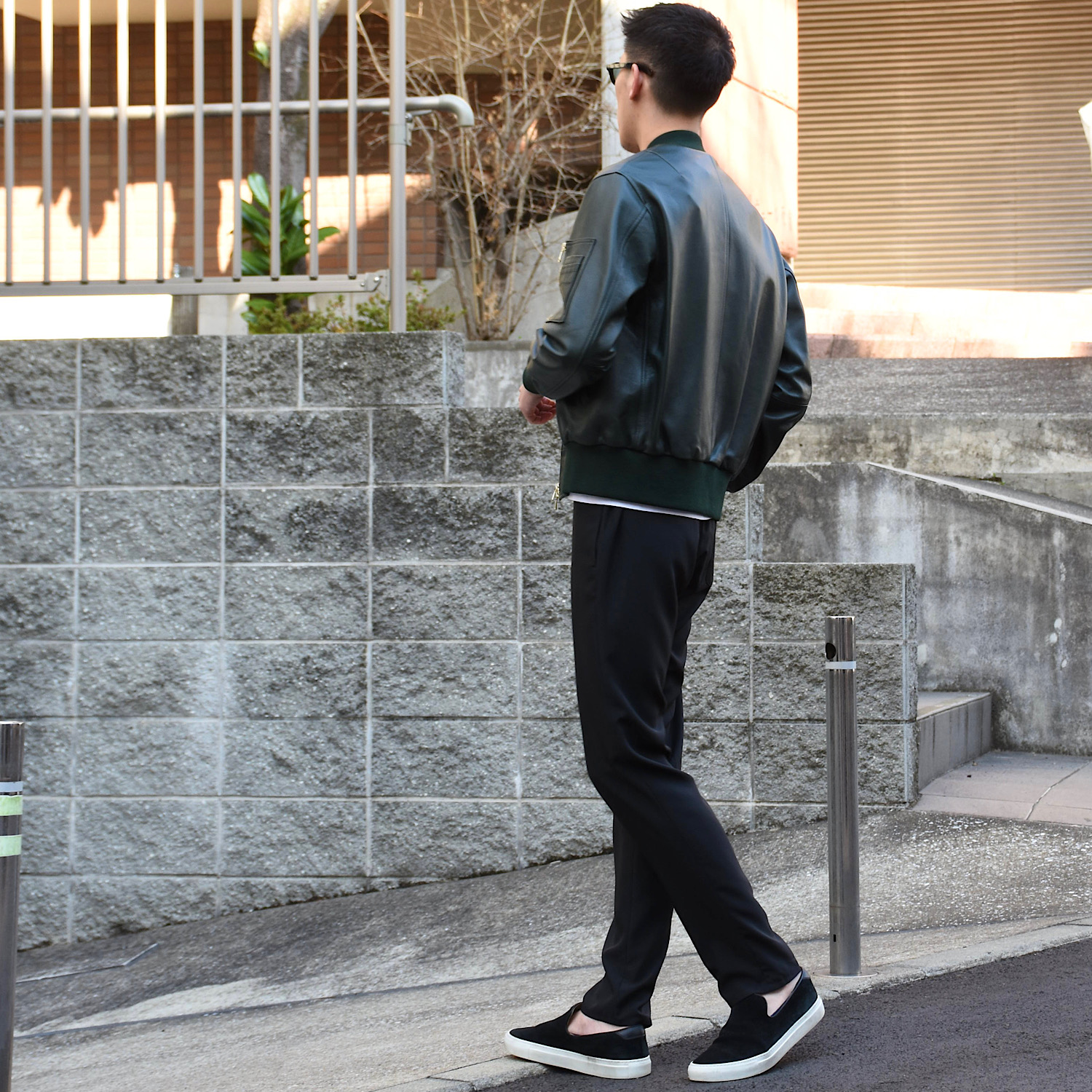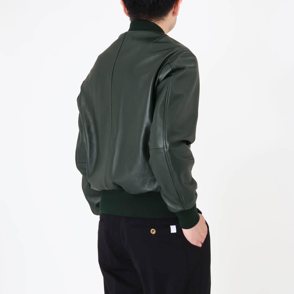 ・MA-1の代表的なディテール、シガレットポケット、風の侵入を防ぐ前立てなどは踏襲しつつ、素材が高品質レザーになるだけで雰囲気がグッとラグジュアリーに。
