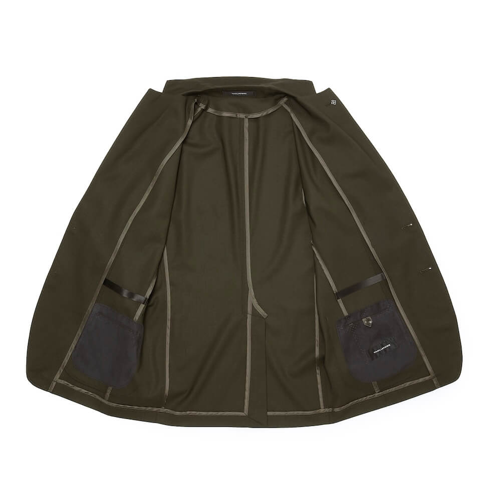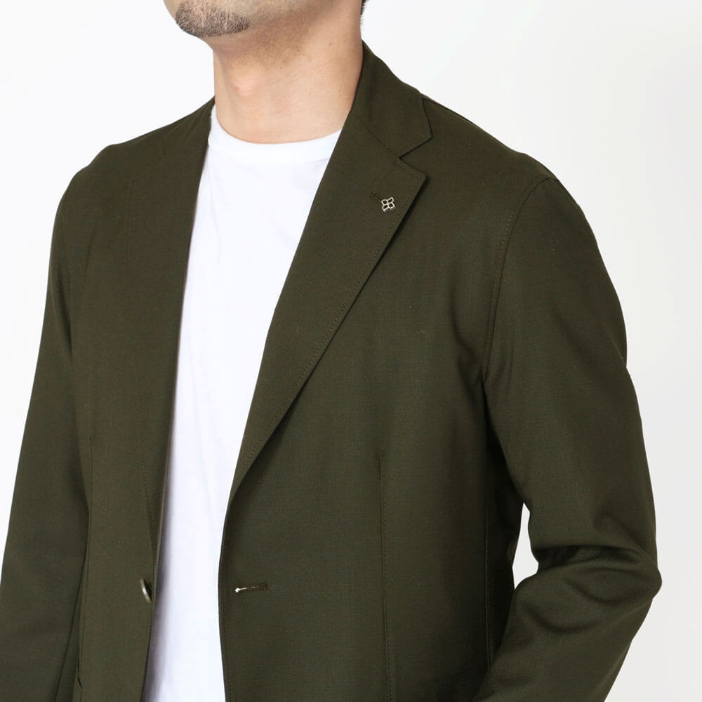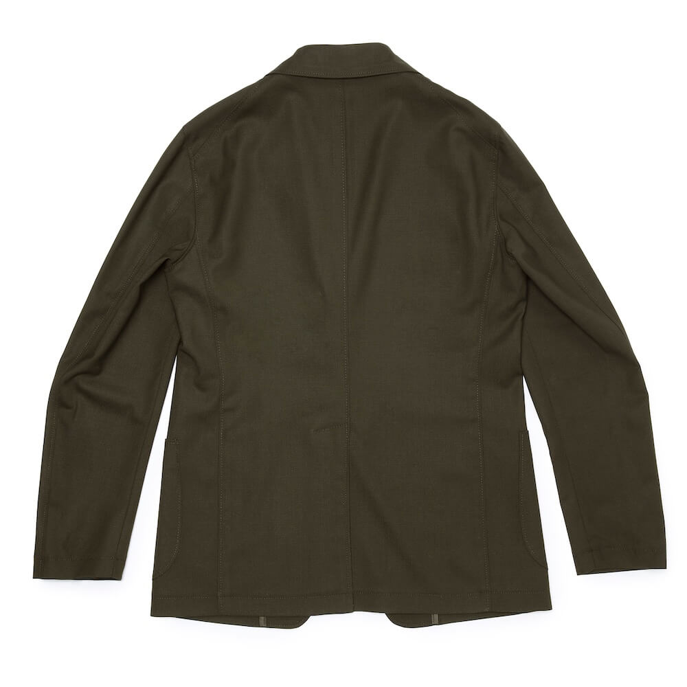 ・形状保持と立体感、そし着心地を良くするためにジャケットのキモとも言える襟と(前身頃の)見返し以外は一枚仕立て。裏地と胸ポケットを省き、筒袖が採用されています。袖丈が合えば、お直し無しで着られるお手軽な一着。極めて軽く柔らかな着心地が特徴です。