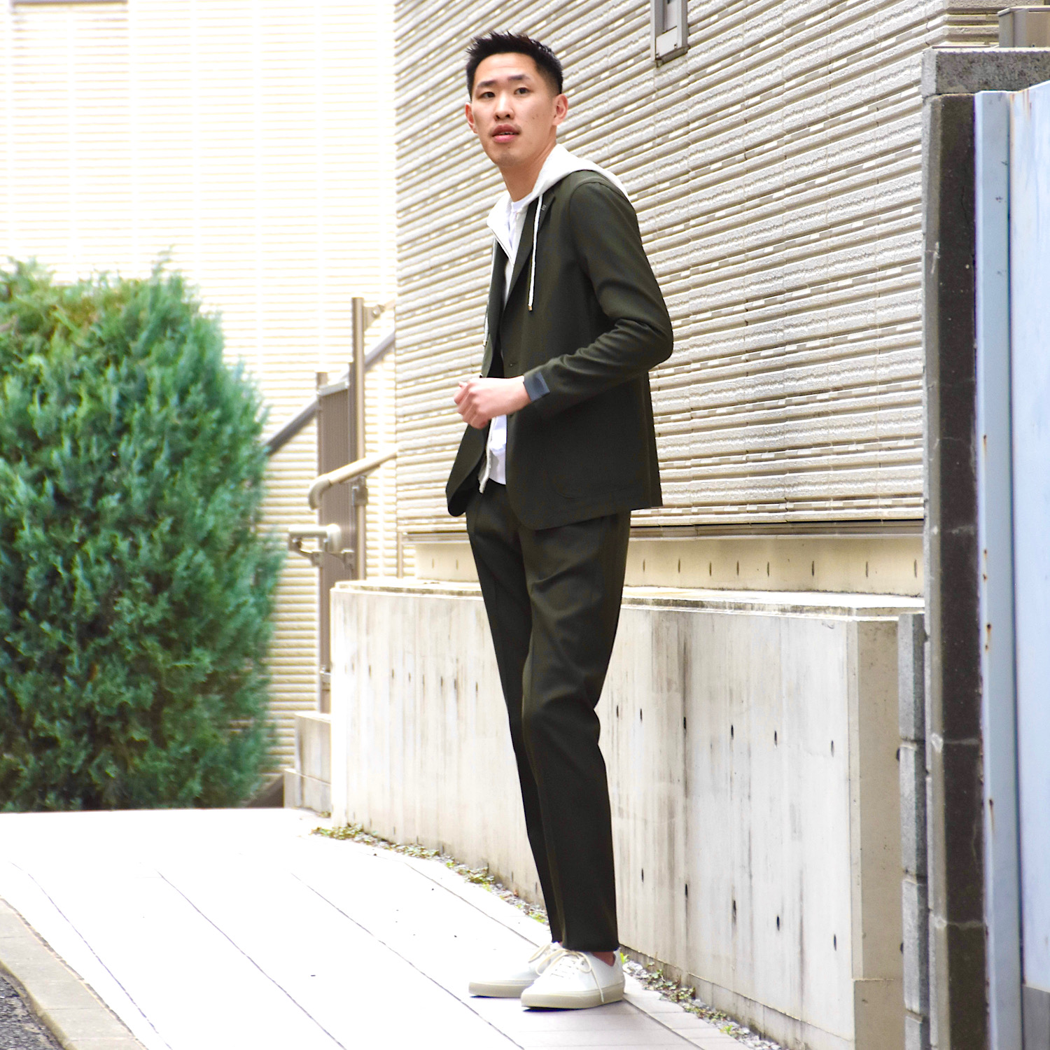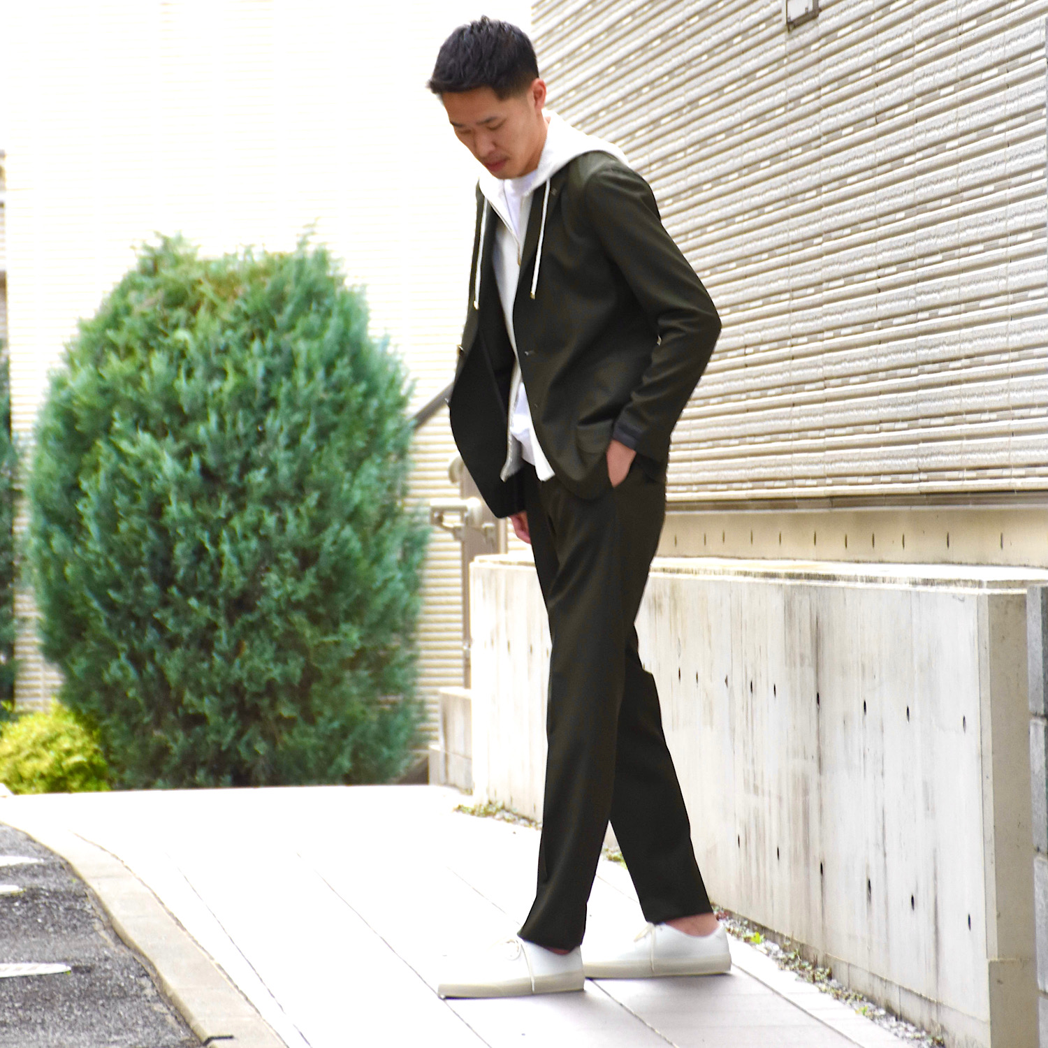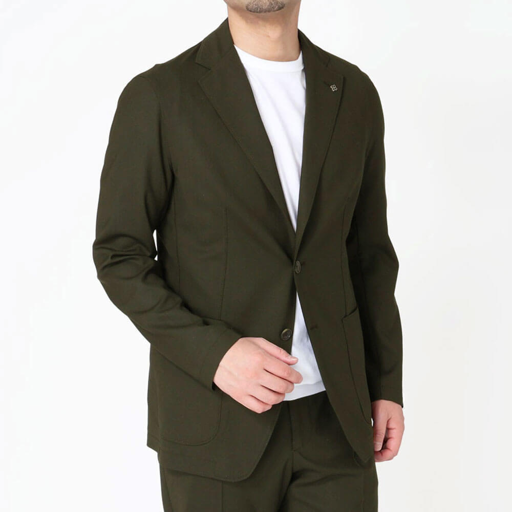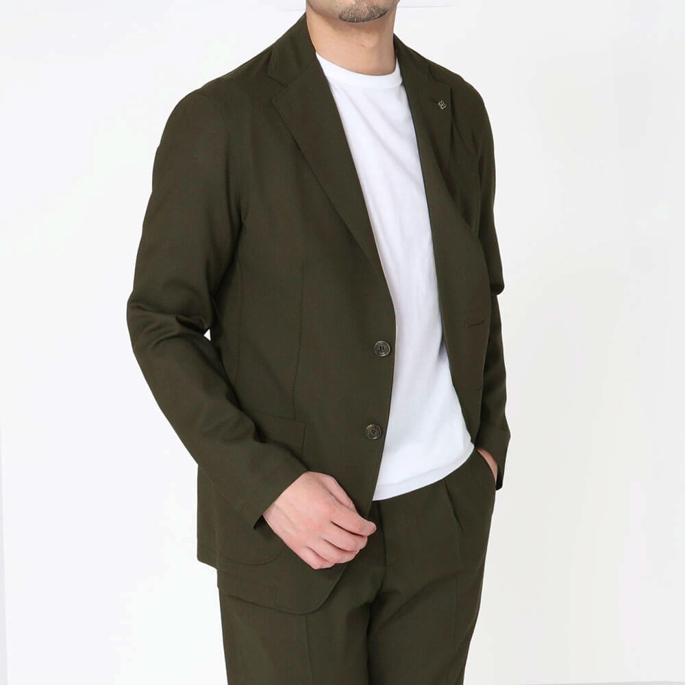・深みあるカーキは、ブラックやネイビーといったセットアップの定番カラーに次ぐ第三軸として要注目。落ち着きがありながら、適度に個性を出すことができます。