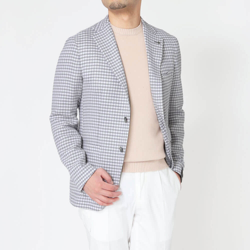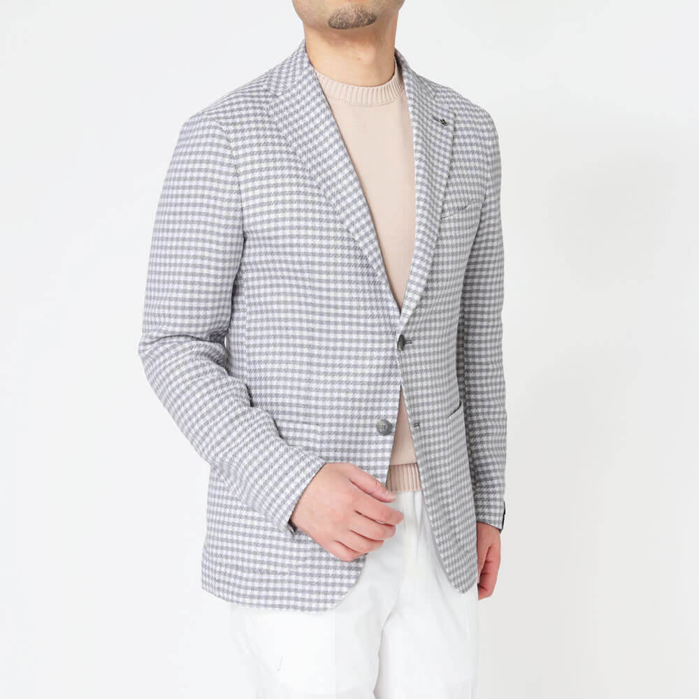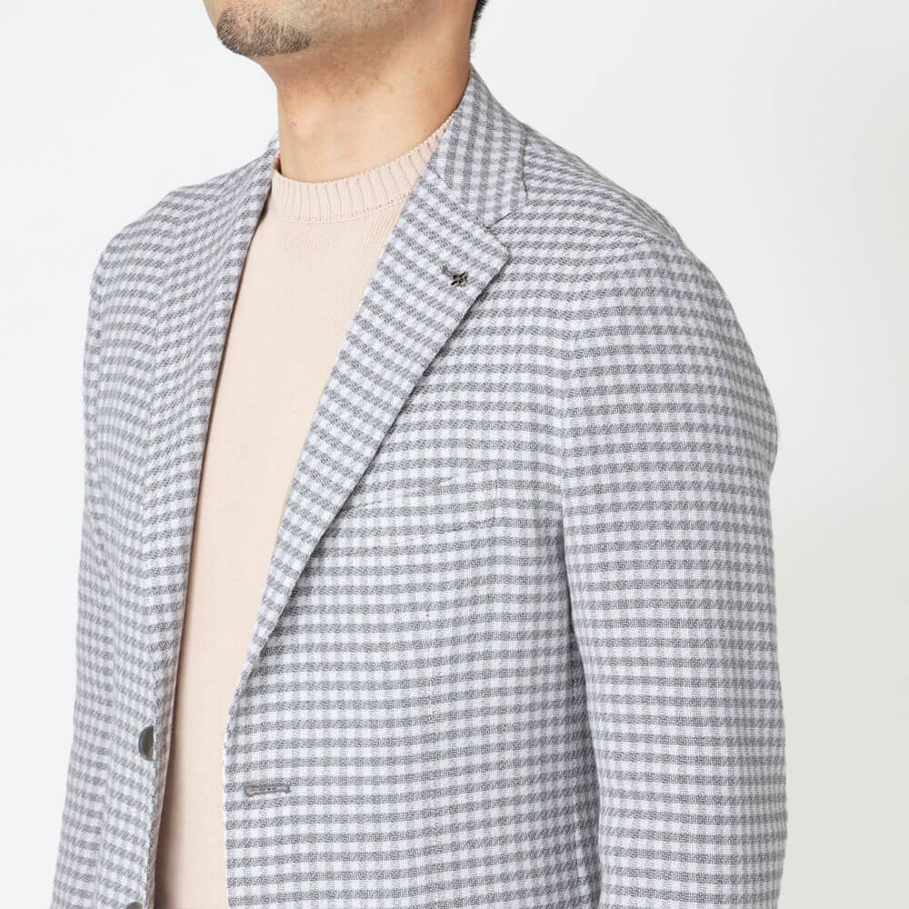 ・ホワイトとグレーを巧みに馴染ませたチェックは、爽やかさと落ち着きを兼ね備え、取り入れやすい柄ジャケです。
