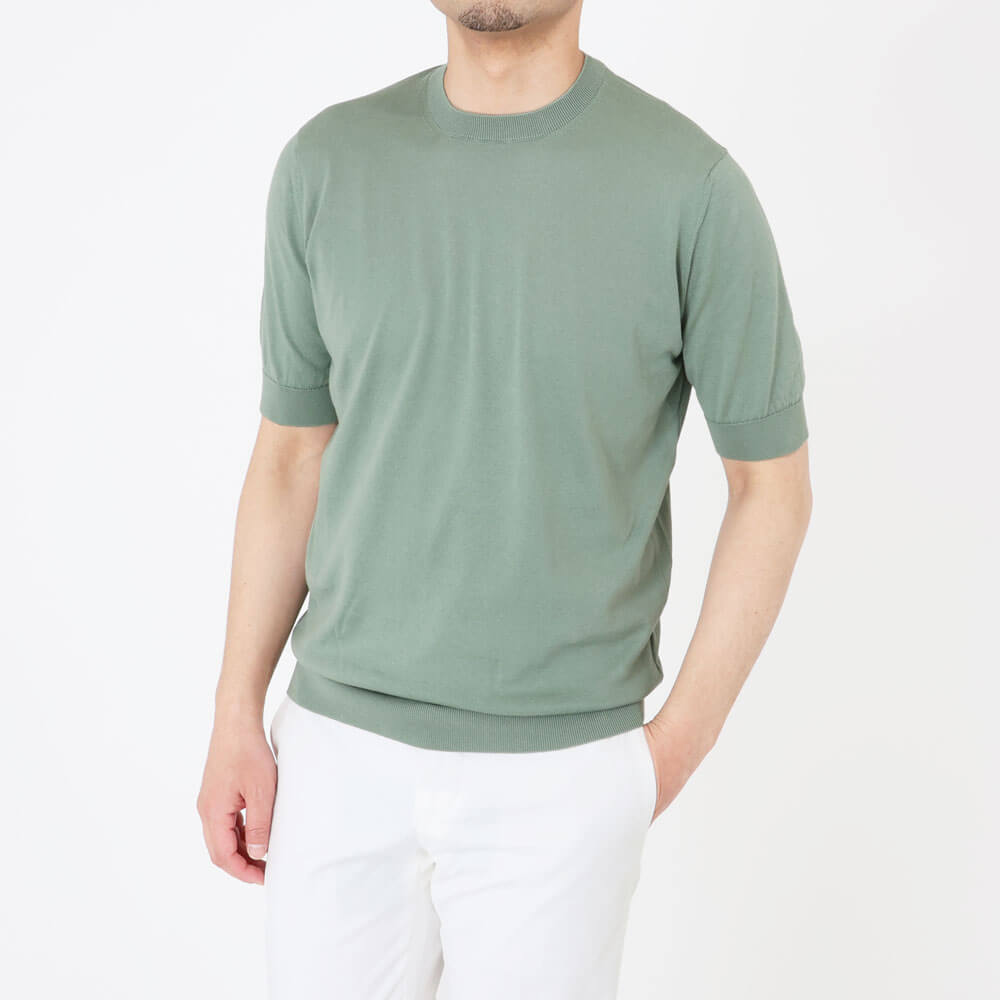 ・18ゲージの天竺編みで仕上げられており、ギザコットンがもたらす滑らかな質感が贅沢な一着。
