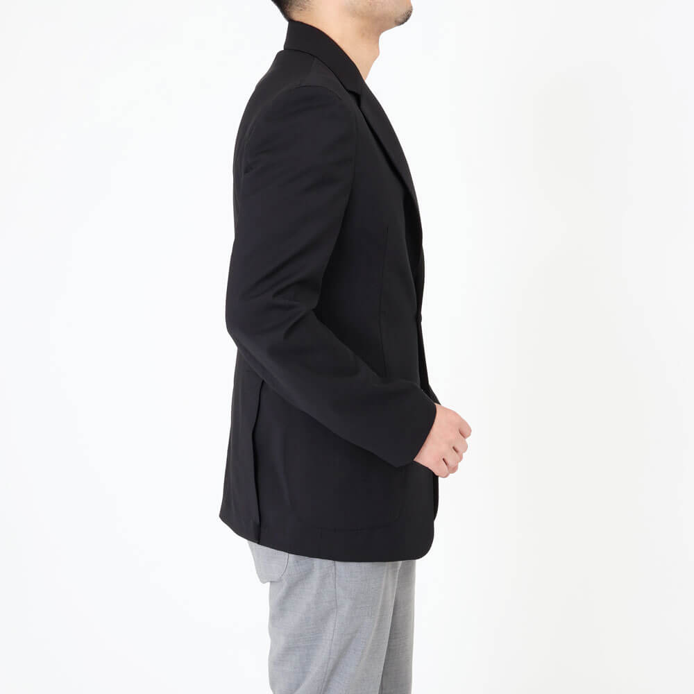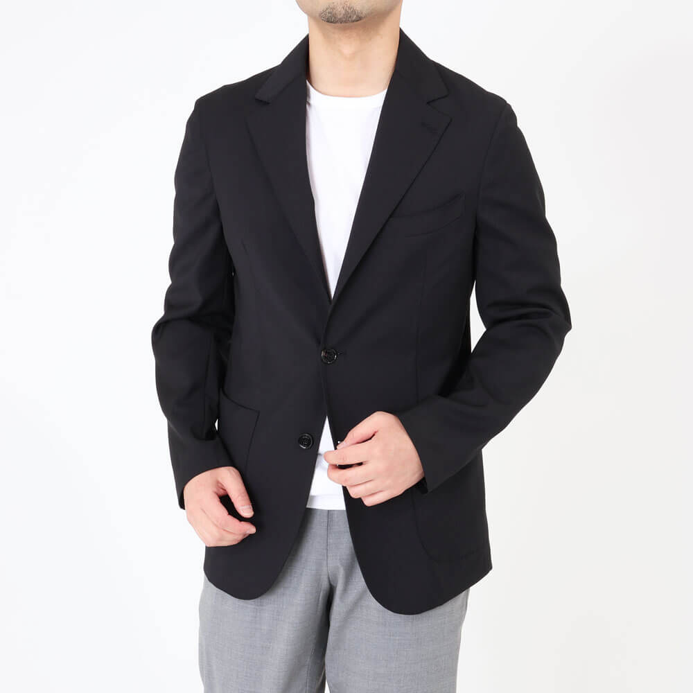 ・イタリアは"ZIGNONE(ジニョーネ)"社の高番手糸で織られたトロピカルウール生地を採用。微光沢が美しく、しなやかでドレープ感のある風合い、ナチュラルな伸縮性があることも特徴です。ダークネイビー/ブラックの2色をラインナップ。同生地のパンツもご用意しております。