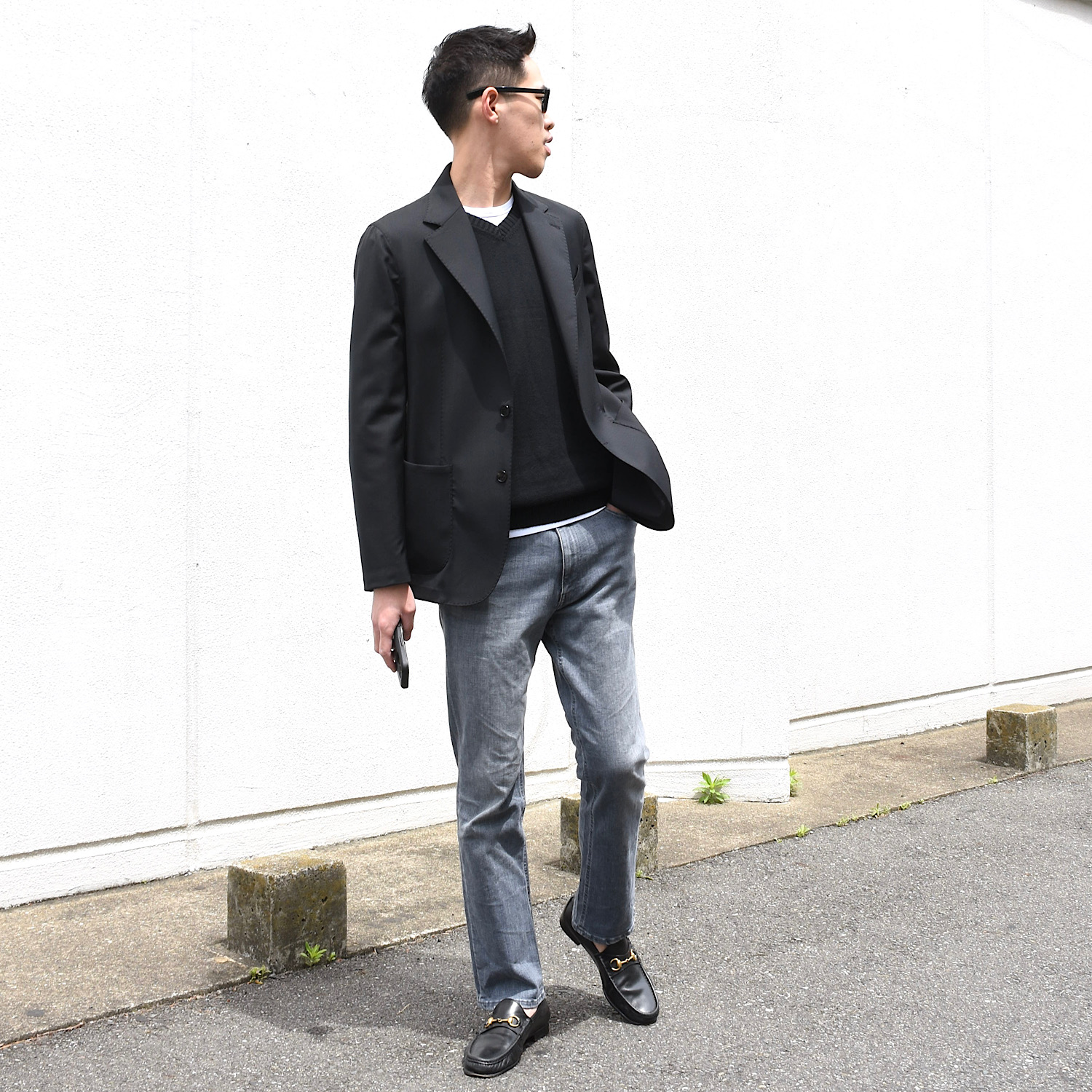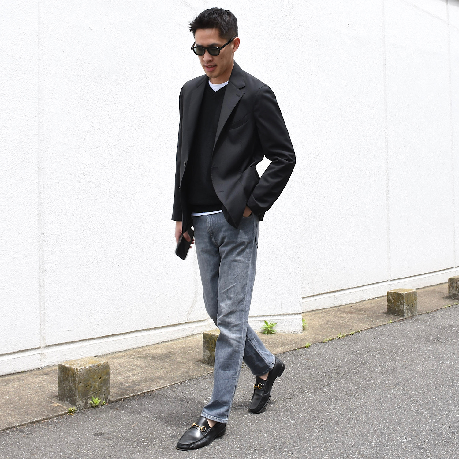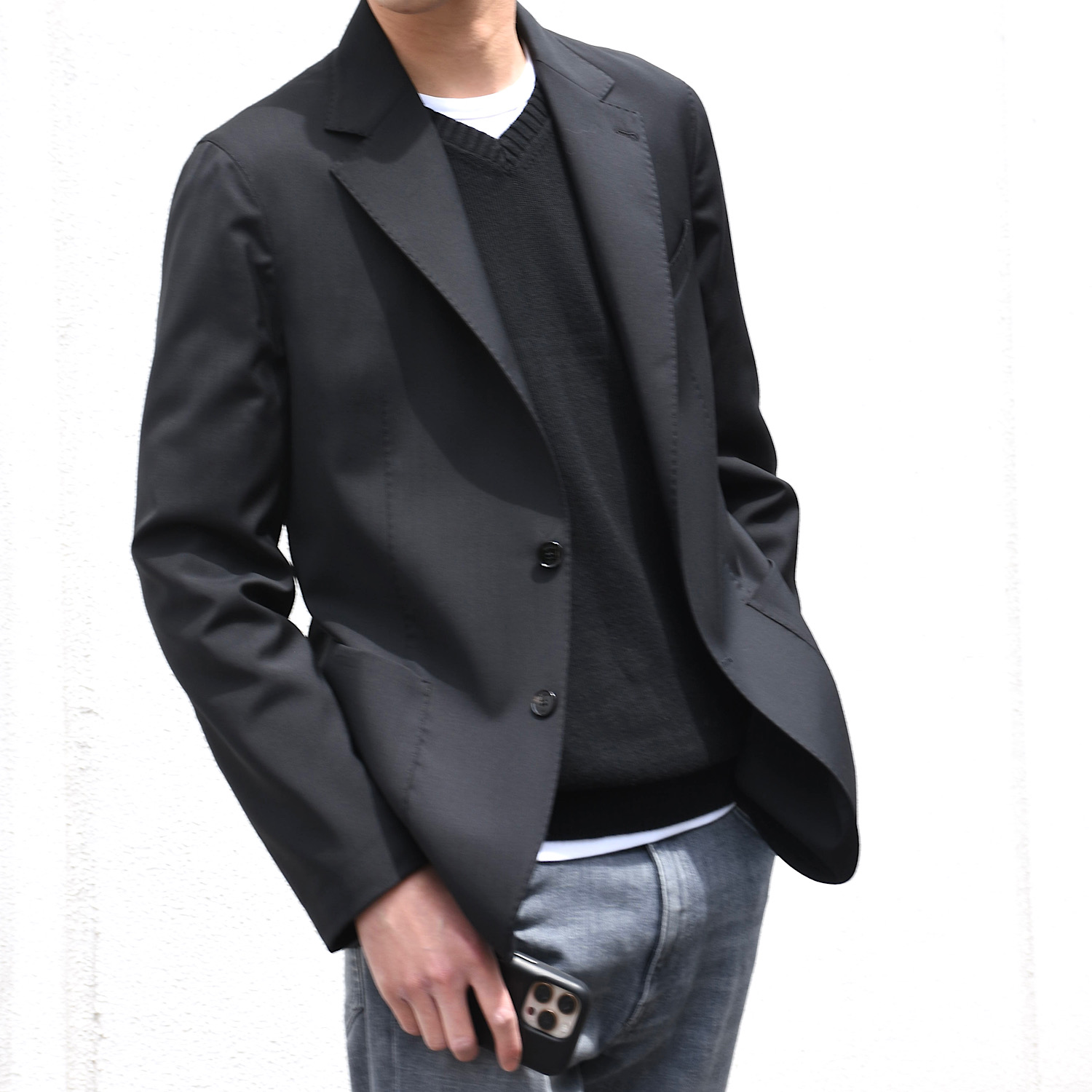 ・ほどよいVゾーンの深さ、緩やかなウエストシェイプ、軽快な着丈、とフロントボタンを留めずに羽織るように着用したい一着です。