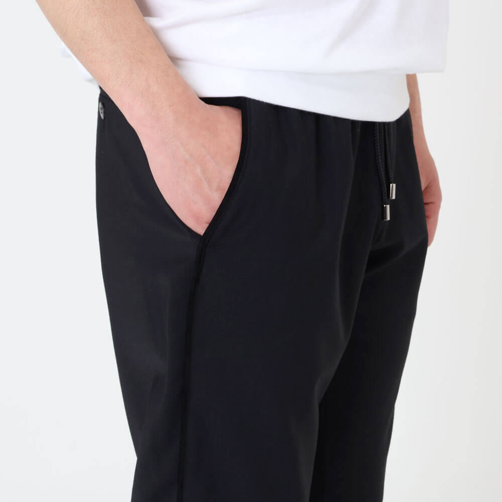 ・緩やかにテーパードするシルエットはリラックス感たっぷり。ゆとりがありながらもパイピング側賞により縦のラインが生まれ、脚長効果に繋がります。