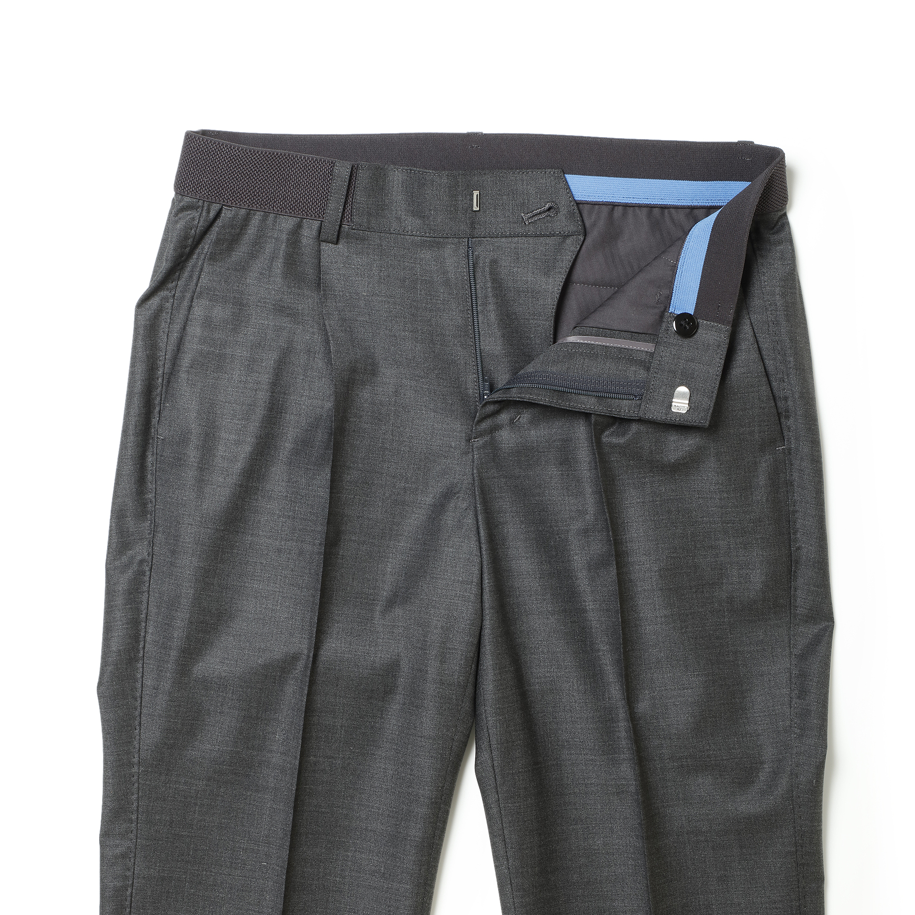 ・数あるモデルの中から、B.R.SHOPでは1プリーツのベルトループ付きモデルをセレクト。ウェスト部分は「NUMBER M(ナンバーエム)」ならではのダブルゴムのフルエラスティックですが、こちらはフックとジップが付属した前開き仕様。着脱がさらに容易です。また、ベルトが着けられるので普通のスラックスのように穿くこともできます。