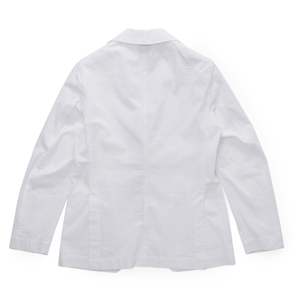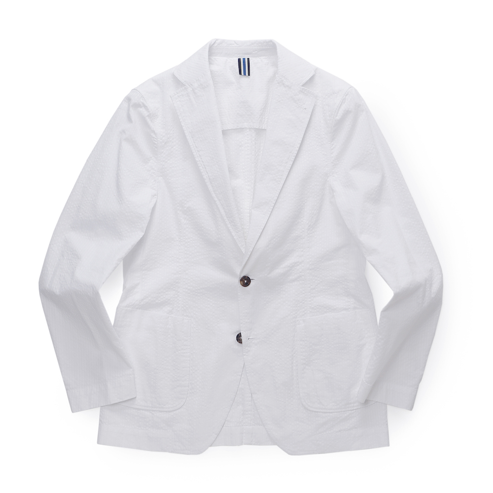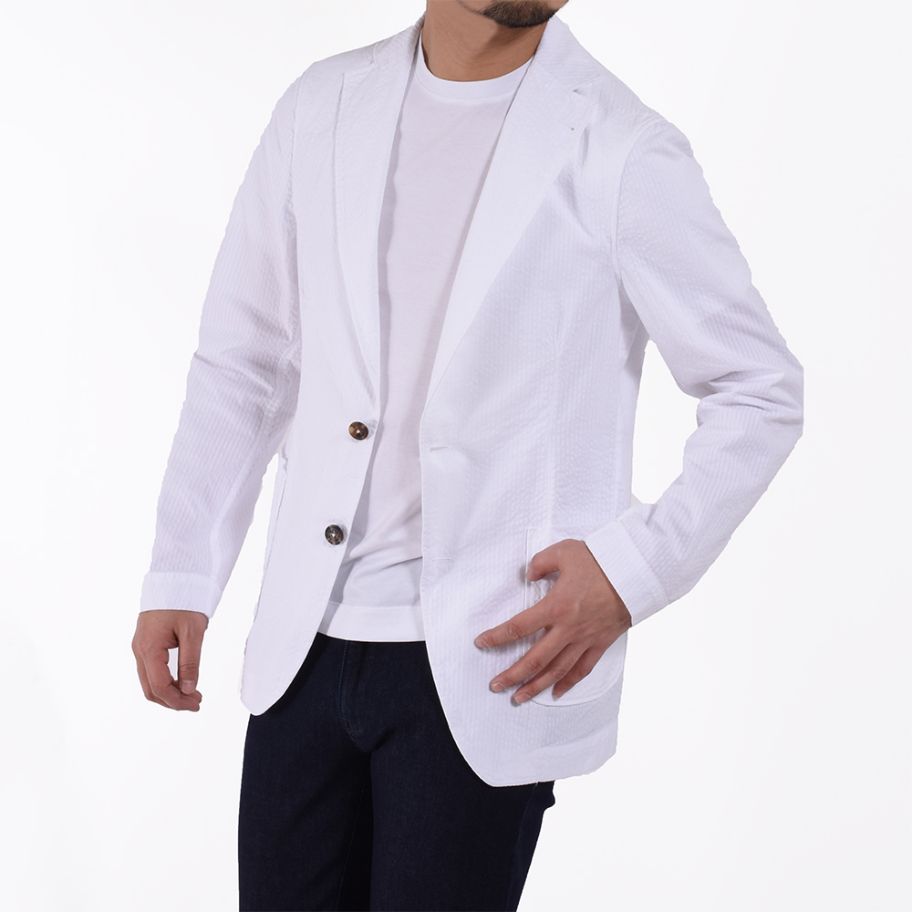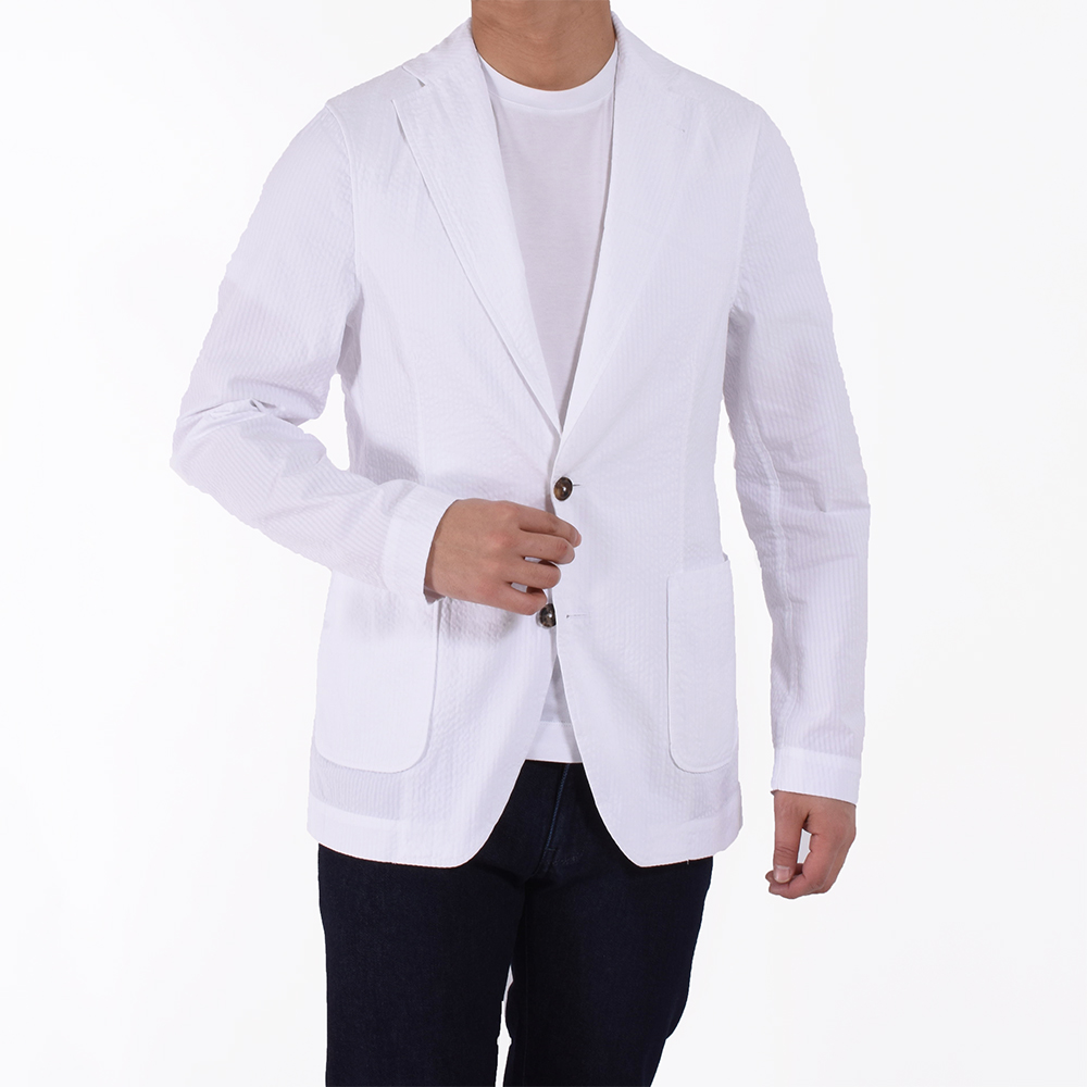 春夏と言えばやっぱり白!清涼感があってラグジュアリーな印象のシアサッカー地の白ジャケが登場!一枚仕立てで軽いジャケットというと肩のラインが綺麗に出にくい印象でしたが、こちらはびっくり!非常に綺麗なラインが出て、本格仕立てのジャケットと遜色ない仕上がり!これは本当にびっくりしました。。。しかもシアサッカー地なので、肌との接地面が少なくとても涼しくすごせます。