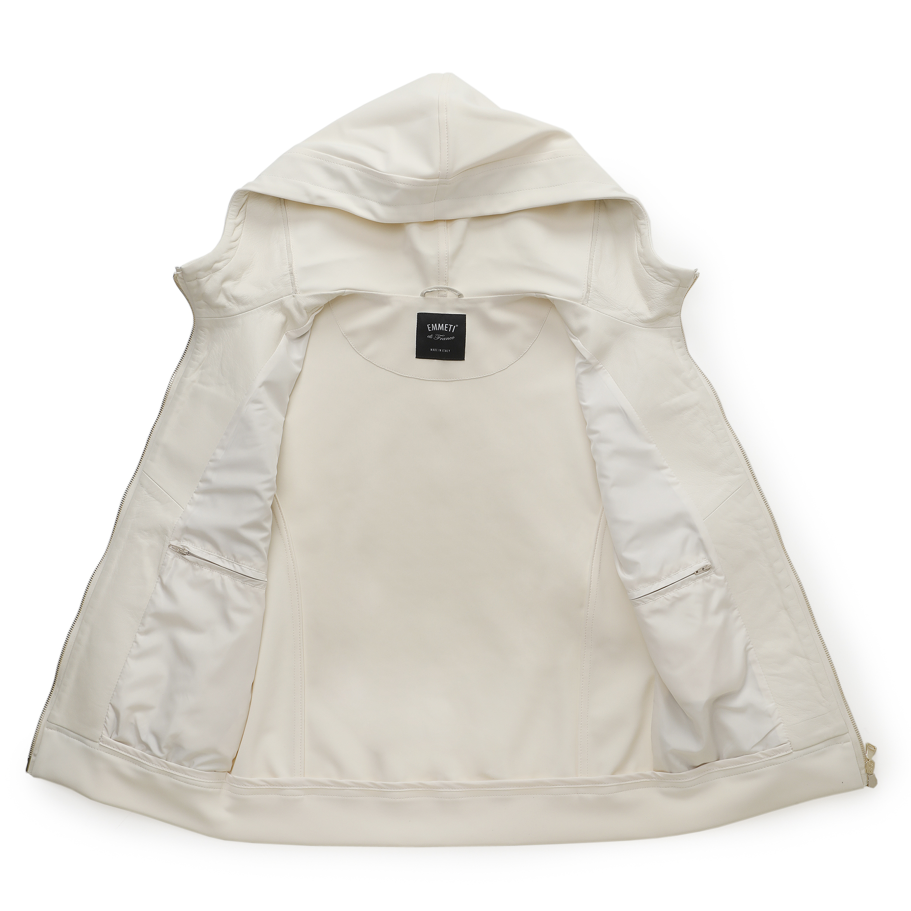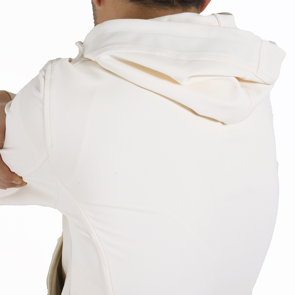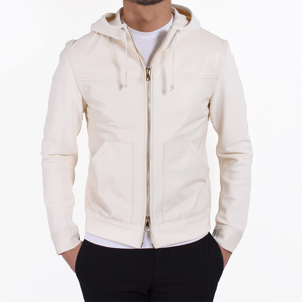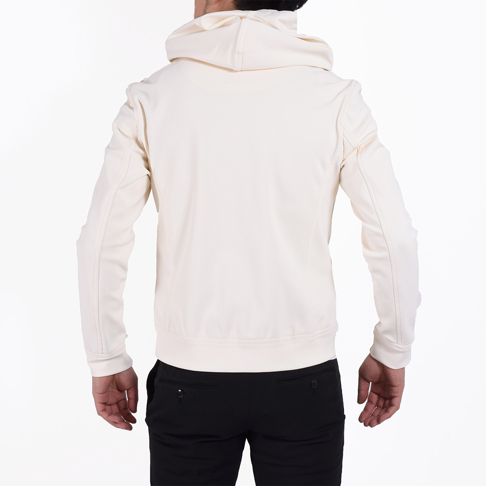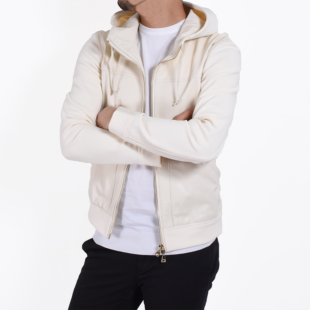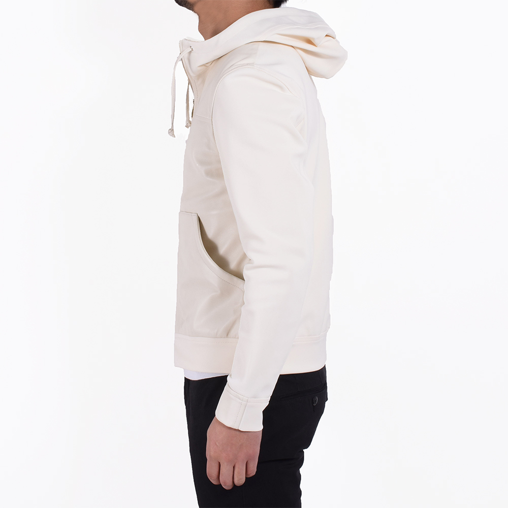 ・前身頃、フード入り口の裏面、袖口の一部分は、まるでシルクを思わせるタッチのしなやかな0.5ミリ厚の軽量ナッパレザー。フード、後身頃、袖、裾周りはネオプレン素材というコンビネーションです。