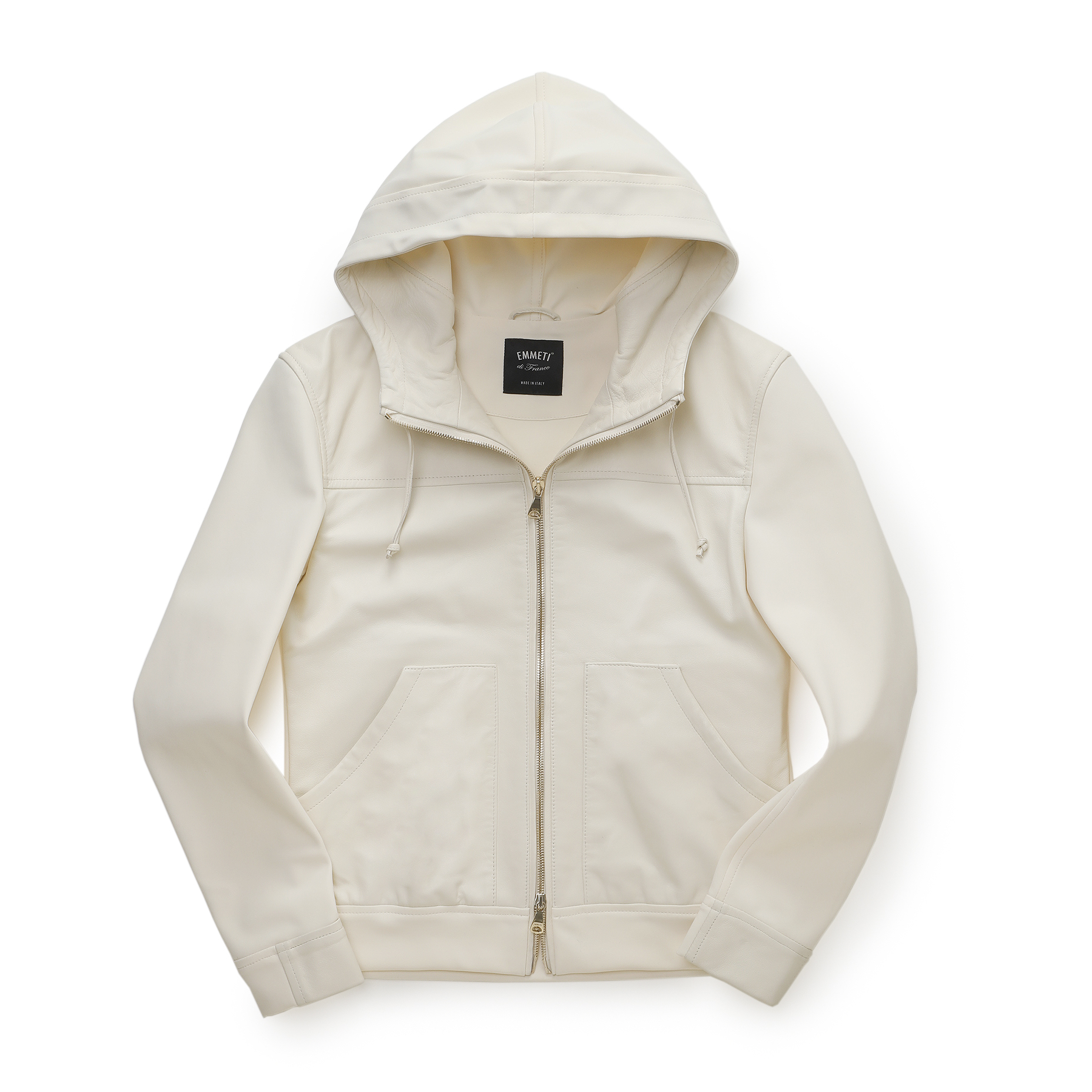 ・通常はシルバーパーツが付属するところを、フードのハトメパーツとフロントジップをゴールド仕様にしています。これによりさらにラグジュアリー感が演出できます。オフホワイトとブラックの2色をラインナップ!