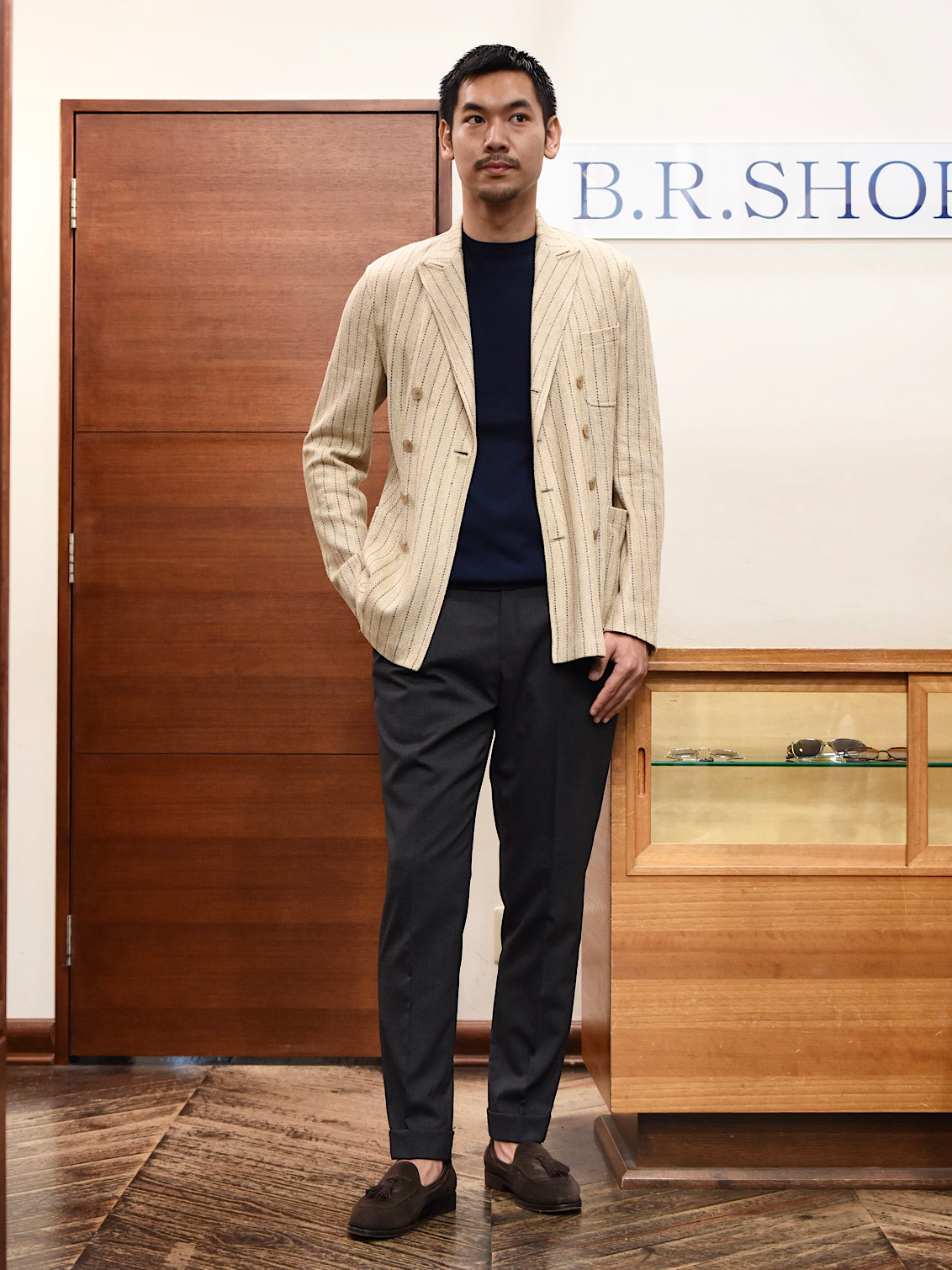 ・袖と裾のリブ幅が広いとニットはクラシカルに見えがち。そこでネックに合わせて袖と裾のリブ幅を細めに設定したのがこちらのBR別注。