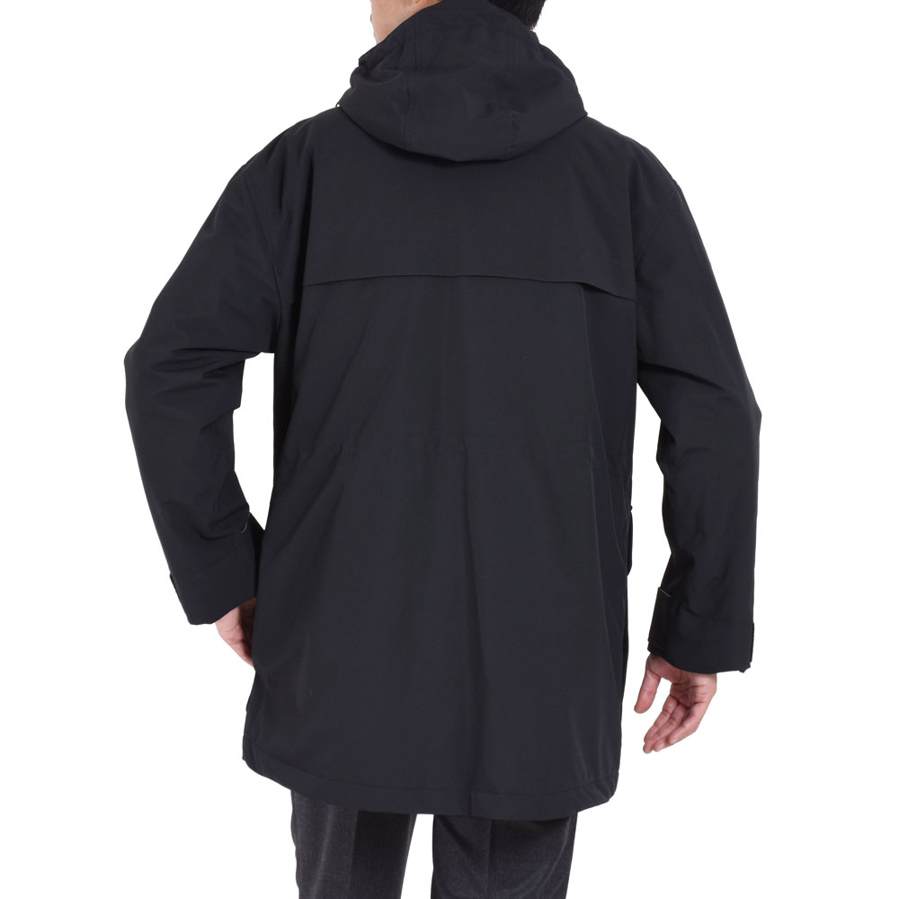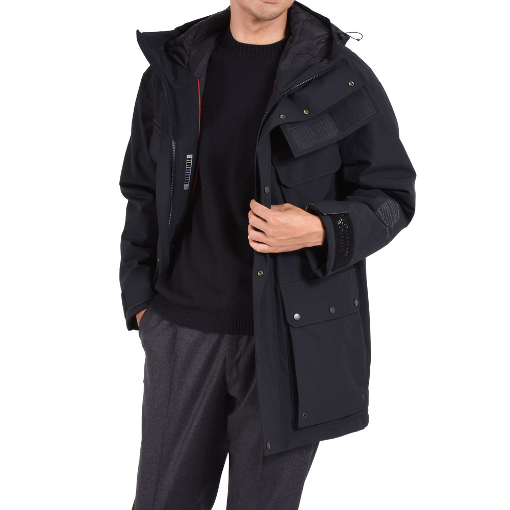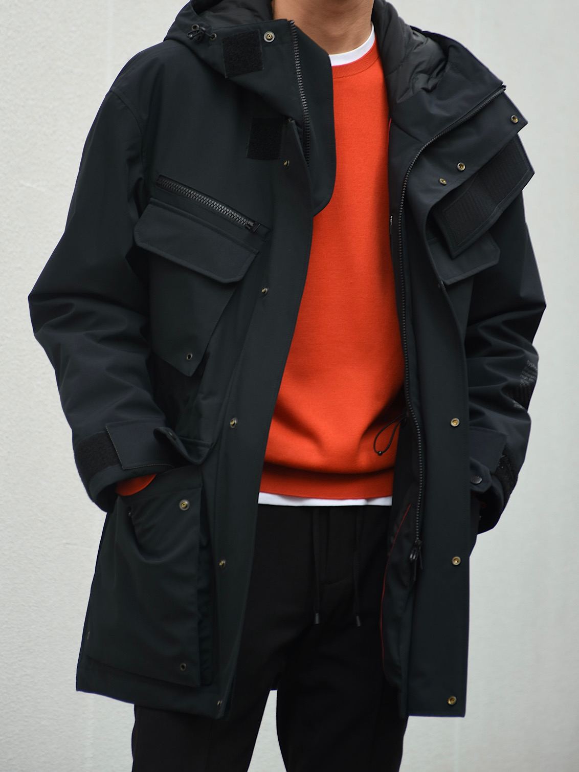 ・フロントジップ裏にはサーモメーターを完備。また携帯電話の電磁波に対して保護シールドが作れる特殊素材を使った内ポケットを含めて、計3つが配されています。表にも計5つのポケットがあるのでこれを羽織ればサクッと手ぶらでお出掛けできます。腰ポケットは二重仕立て。上と横の2カ所からアクセス出来ます。