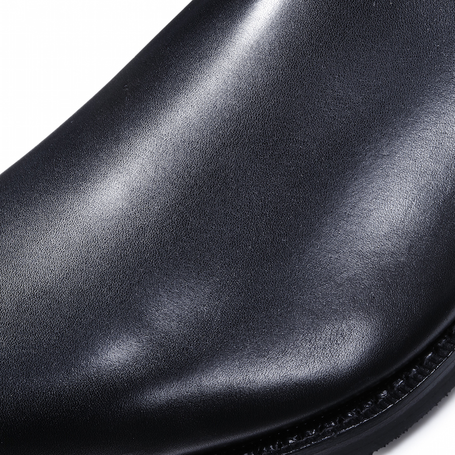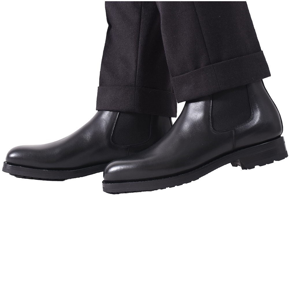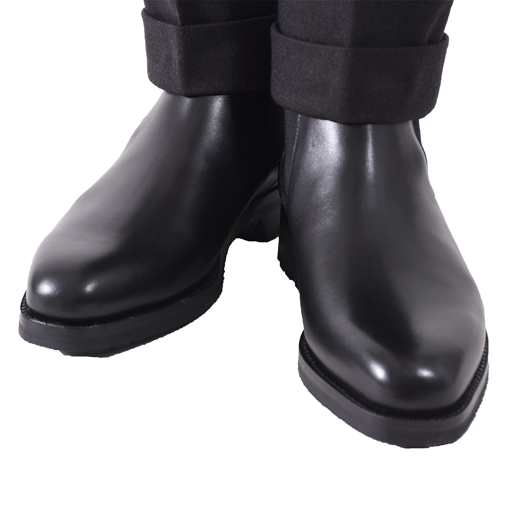 大人の雰囲気が漂ようこちらのサイドゴアブーツ。秋冬時には重宝するのは間違いなしであろう一足です。硬すぎないカーフレザーなので、長時間履いていても疲れる心配はありません。しかもソールには元々登山用として開発されたビブラムソールを使用しているので、滑りにくく、耐久性に優れています。履き口がかなり細くなっているのでパンツの裾にすっぽり納まり、パンツのシルエットを崩すことなく履けます。