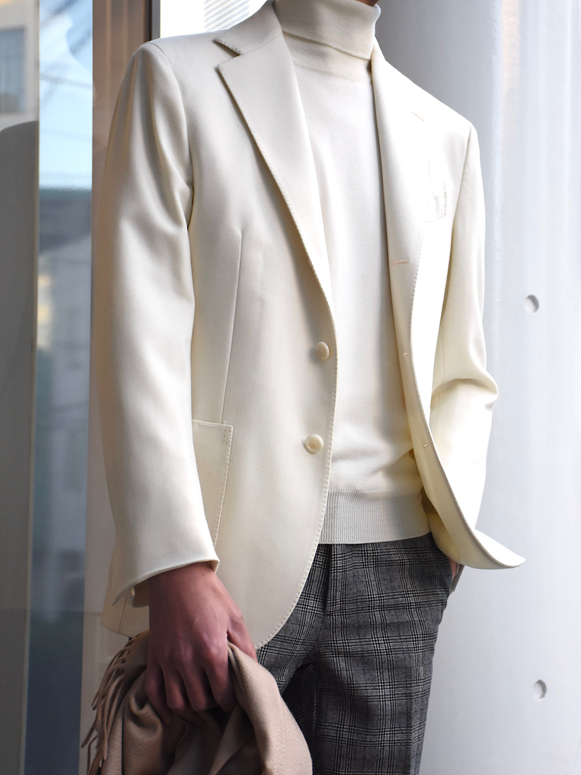 柔らかなサキソニーの生地感ではありますが、しっかりとした仕立てなので、胸周りや肩線はとても立体感があり男らしい印象に見せてくれる印象でした。そしてリッチ感漂ようクリーム色は、ウィンターホワイトのコーディネートには間違いない1着ですね!この色のジャケットに抵抗感ある方が数多くいらっしゃるかと思いますが、ブルーデニムなど合わせてできるだけカジュアルに見せてあげるとキザな印象が無くなります!難易度の高いジャケットですが、着こなす事ができると、非常にカッコいい印象を作る事ができます!個人的にもこちらのジャケットのコーディネートを試行錯誤して考えておりますので、コーディネートのご質問がございましたらB.R.SHOPまでご連絡お待ちしております!是非アドバイスさせて頂けたらなと思います。