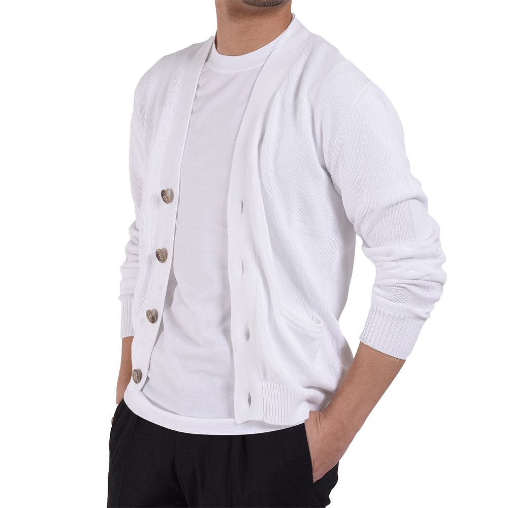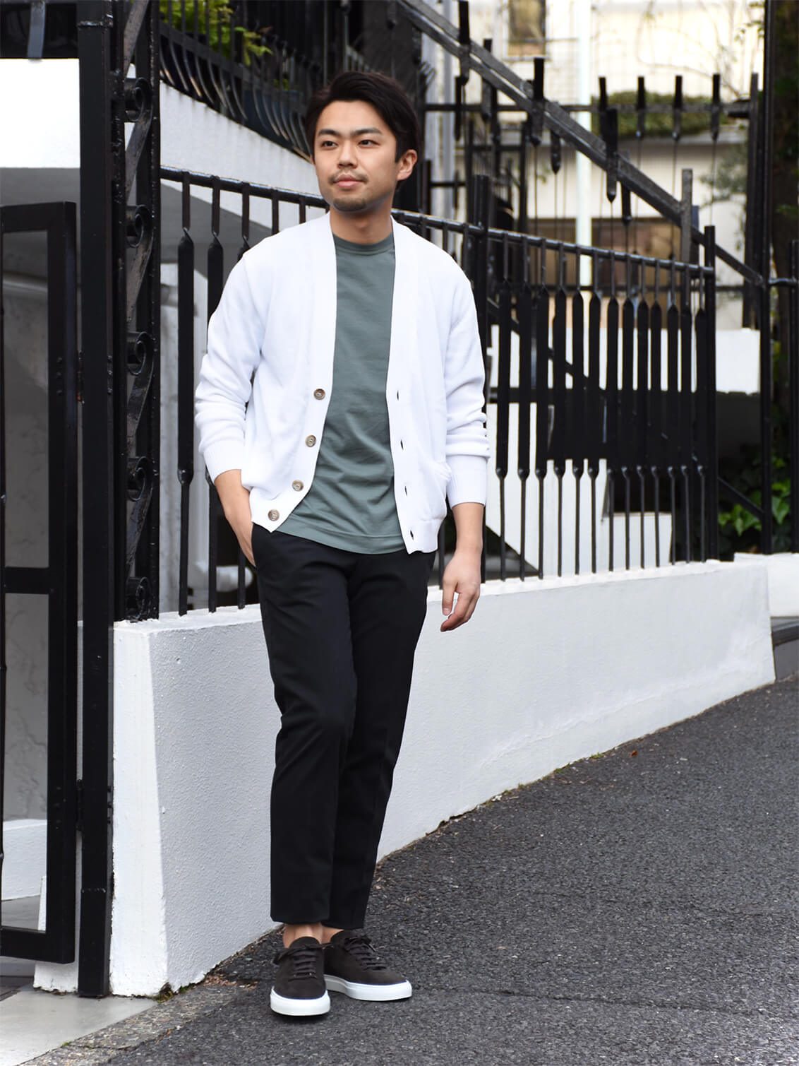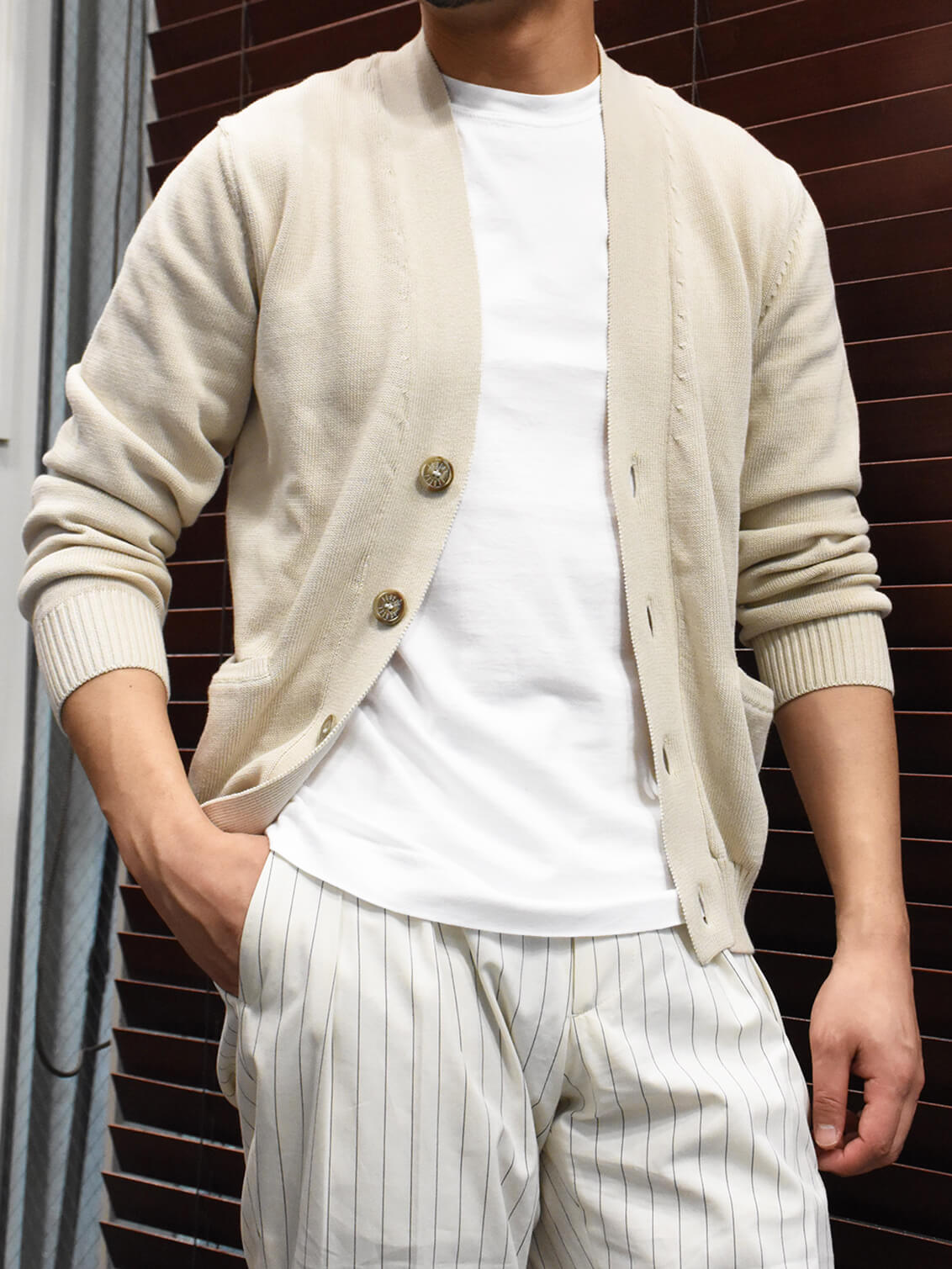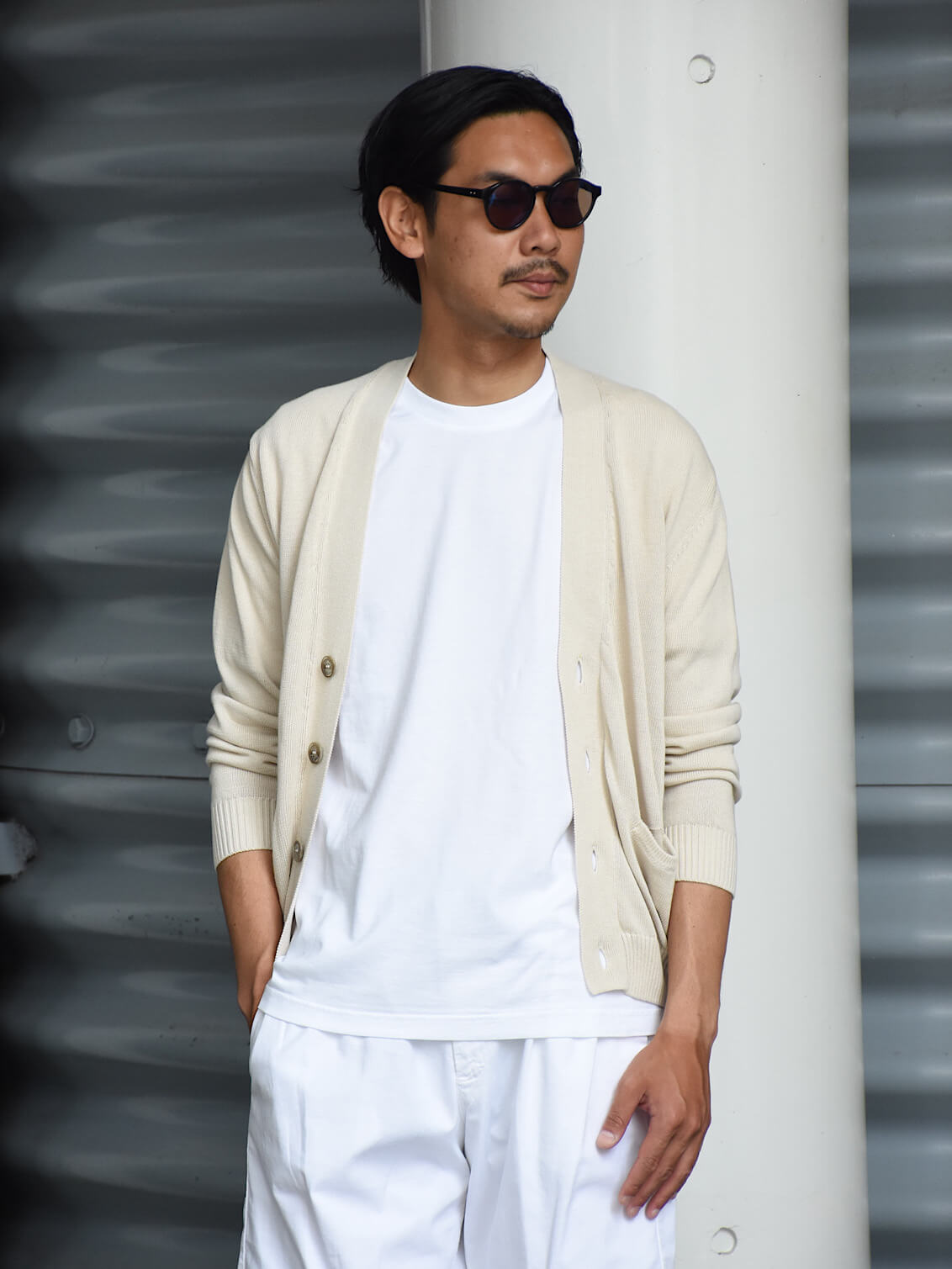 春夏シーズン使える鉄板羽織りアイテムと言えば、カーディガン! カットソー1枚だけだとと何か物足りなくて、でもジャケットは着たくないという時に使えますね〜! カットソーの上からはもちろんですが、コットンニットの上から着用してニットオンニットでも◎カーディガンを羽織るだけで、大人な印象を作る事ができるので本当に使えるアイテムです。 編み地はミドルゲージでしっかりとした質感になっております。