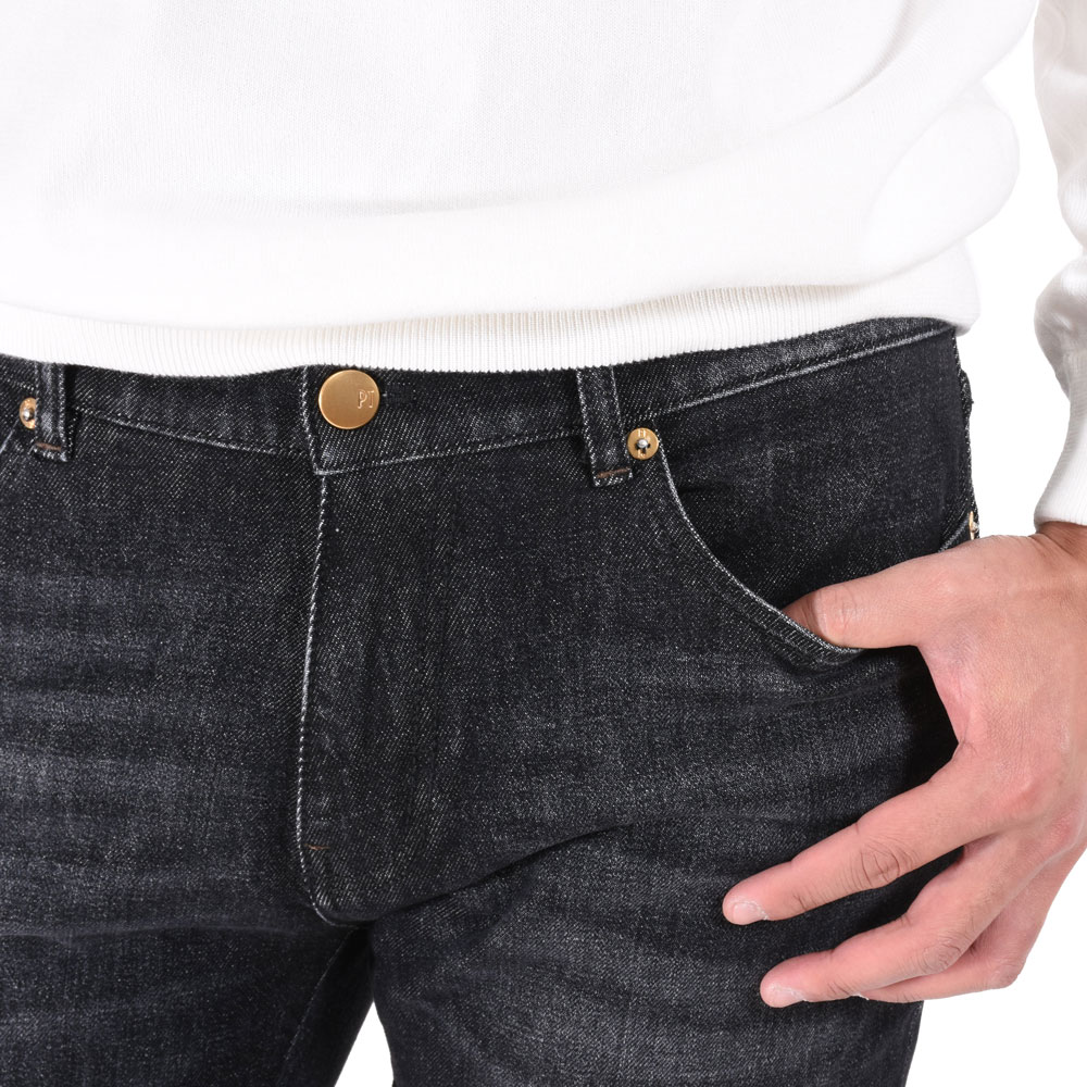 販売しては即完を繰り返し、前代未聞のデニムパンツの予約受注販売も行ったPTブラックデニムが更なる進化を果たして、BR別注ゴールドパーツとして新登場致しました!PTブラックデニムの勢いはまだまだ止まりませんね!ゴールドパーツを施した箇所は、ジップやボタン、そしてレザーパッチにPTのゴールド文字が入っており、ストイックな印象のブラックデニムにラグジュアリーな要素をプラス。トップスを着用していた場合はゴールドパーツは見えませんが、チラッと覗いた時にアクセントになります。シルエットはモデルSWINGよりも細身になっております。また、僕も通常モデルのモデルROCKを所持しているのですが、スッキリとしたシルエットを演出してくれます!そして、ストレッチが効いているので細身なのに窮屈感は一切ございません!車や自転車の運転はもちろん、お座敷などでもノンストレスで穿けるパンツに。裾上げのお直しをする場合は、裾口のアタリをそのまま活かす、裾残し挟み込み仕上げをお勧め致します。