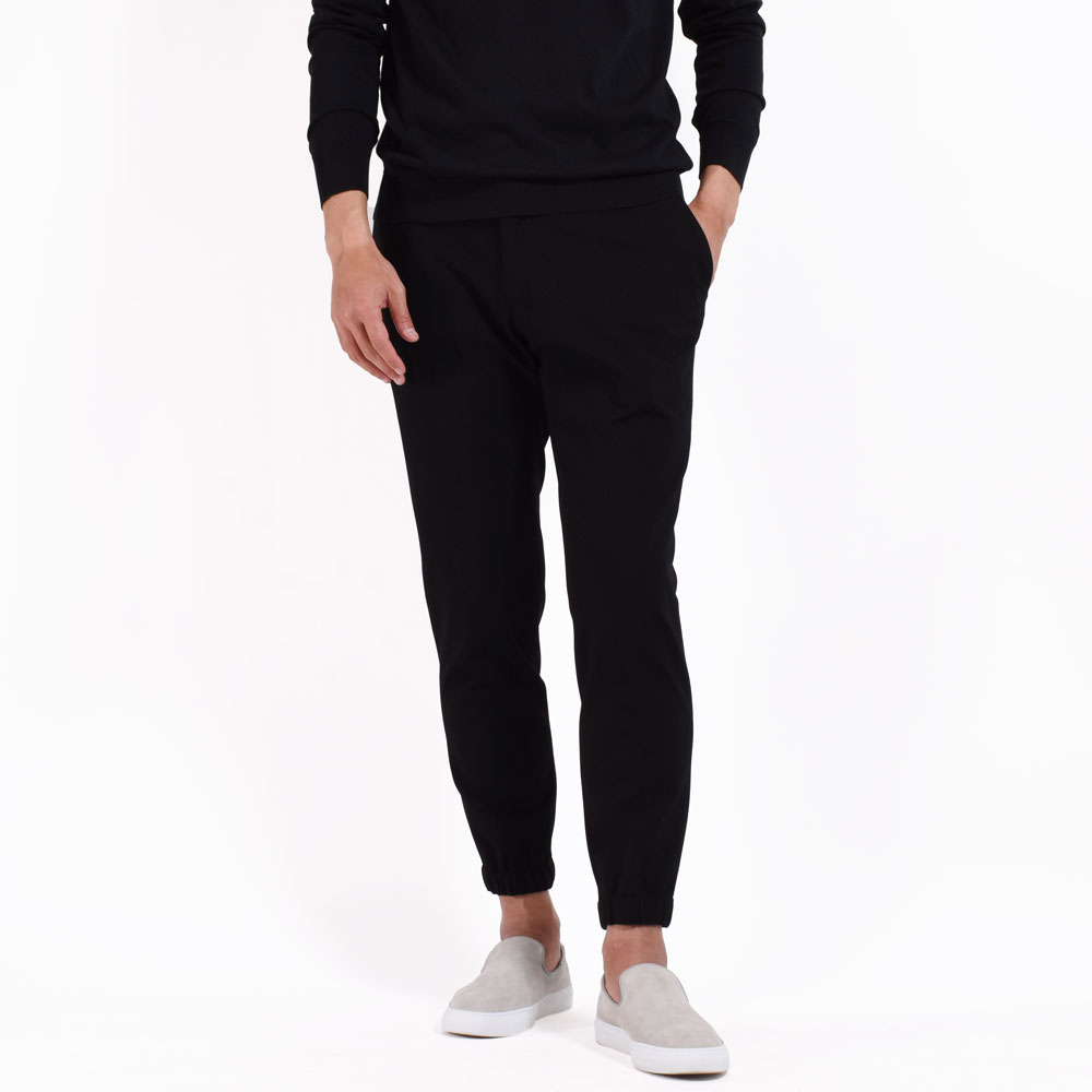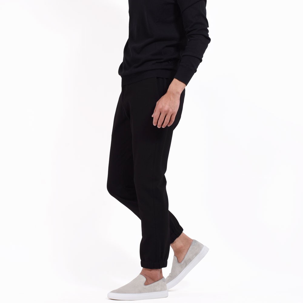 サラリとした肌触りながら、ハリのある生地感。ジャージーならではのストレッチがかなり効いており、着用していて非常に楽ちん!ジャージー生地なら少し部屋着感が出てしまう事もありますが、こちらのパンツはそんな事ございません!理由としては、ジャブスならではのディテールやシルエットが、大人らしさを演出してくれます。こちらは裾口にシャーリングが施されており、スポーティな印象がありながらも、甘めにセンタークリースが入っており、きちんと感がございます。