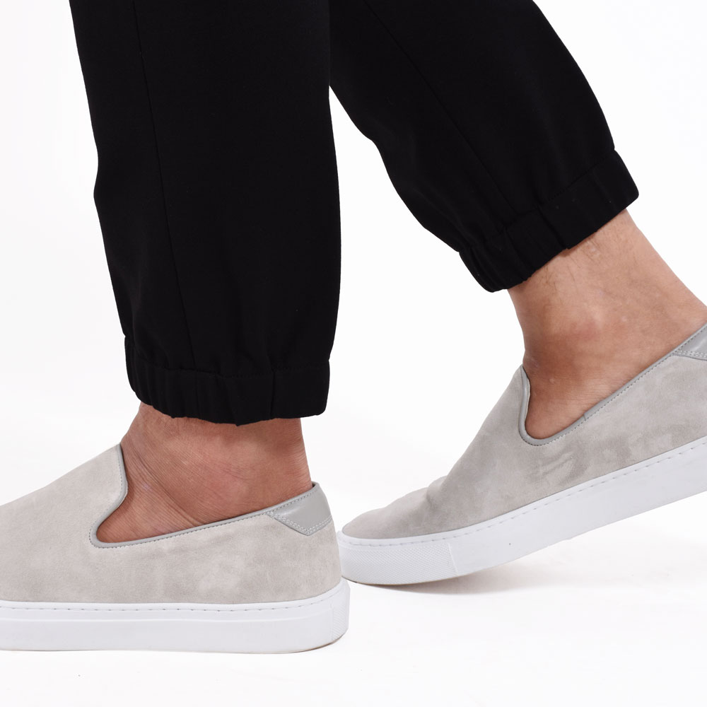 ・シルエットはスリムテーパード、そして裾がゴムシャーリング仕様となっていることでスポーツテイストが加速。股上浅めでなだらかに美しくテーパードしていくシルエットは「giabsarchivio(ジャブスアルキヴィオ)」ならでは。モードかつスポーティです。