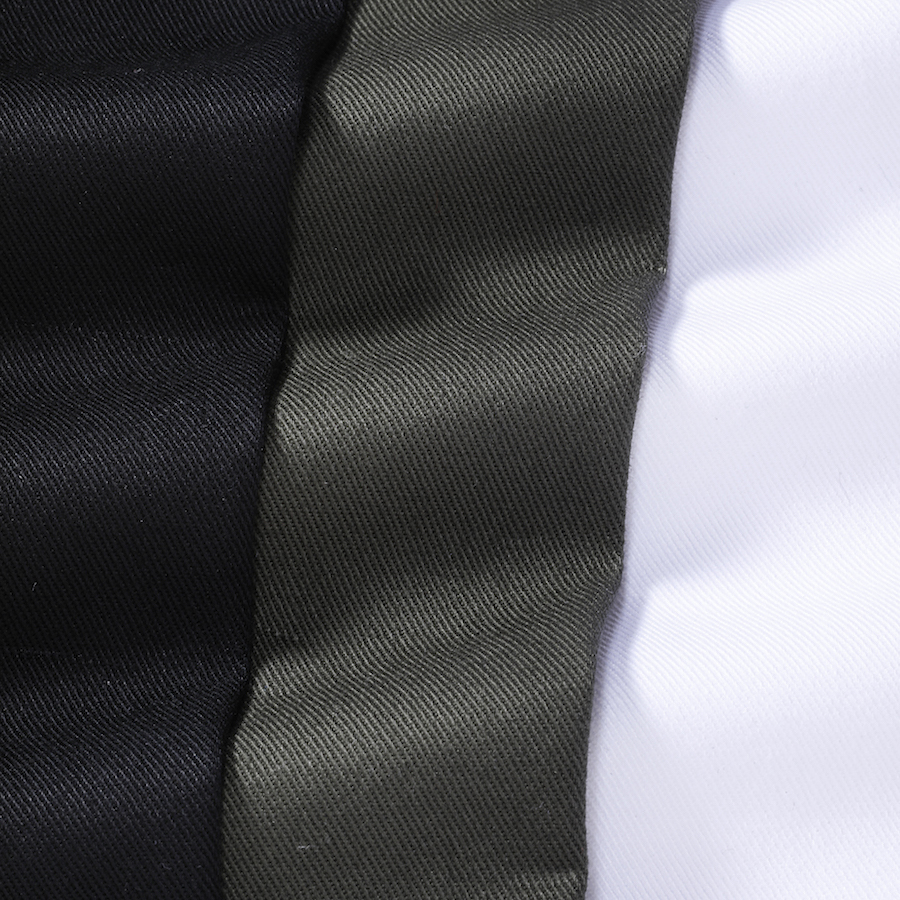 ・生地染めゆえの深くはっきりとした色合い、強撚によるシャリっとした生地感も特徴。ある程度の厚みがあるので真っ白でもほぼほぼ透けません。全3色をラインナップ。