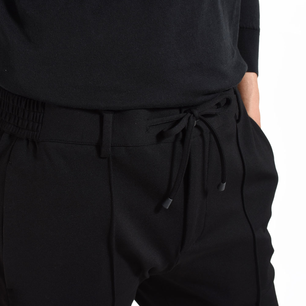 サラリとした肌触りながら、ハリのある生地感。ジャージーならではのストレッチがかなり効いており、着用していて非常に楽ちん!ジャージー生地だと少し部屋着感が出てしまう事もありますが、こちらのパンツはそんな事ございません!なぜならジャブスならではのディテールやシルエットが、大人らしさを演出してくれます。サイドのウエストシャーリングゴムやドローコード、つまみ縫いが施されたセンタークリースは綺麗目且つスポーティに見せてくれるのがポイントですね!