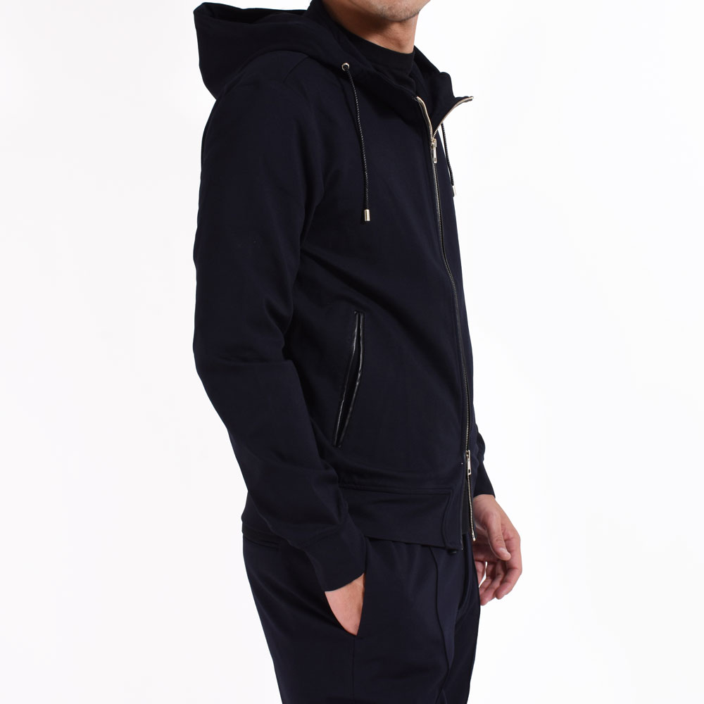これ1着でラグスポスタイルが仕上がります!スポーティなパーカーではございますが、こちらのgiabs_GOLDは一味違います!ジップや細かなパーツをゴールドにしたり、シンセティックレザーのパイピングを施したり、フード紐をメッシュ素材にしたりなど、パーカーにラグジュアリーな要素を加えており、見ただけでリッチ感あるオーラを醸す1着に。生地はハリ感がありながら伸縮性は抜群のジャージー!また、台襟が付いておりジップを上まで閉めた時に、襟が立つようになっており、クールな印象がございます。