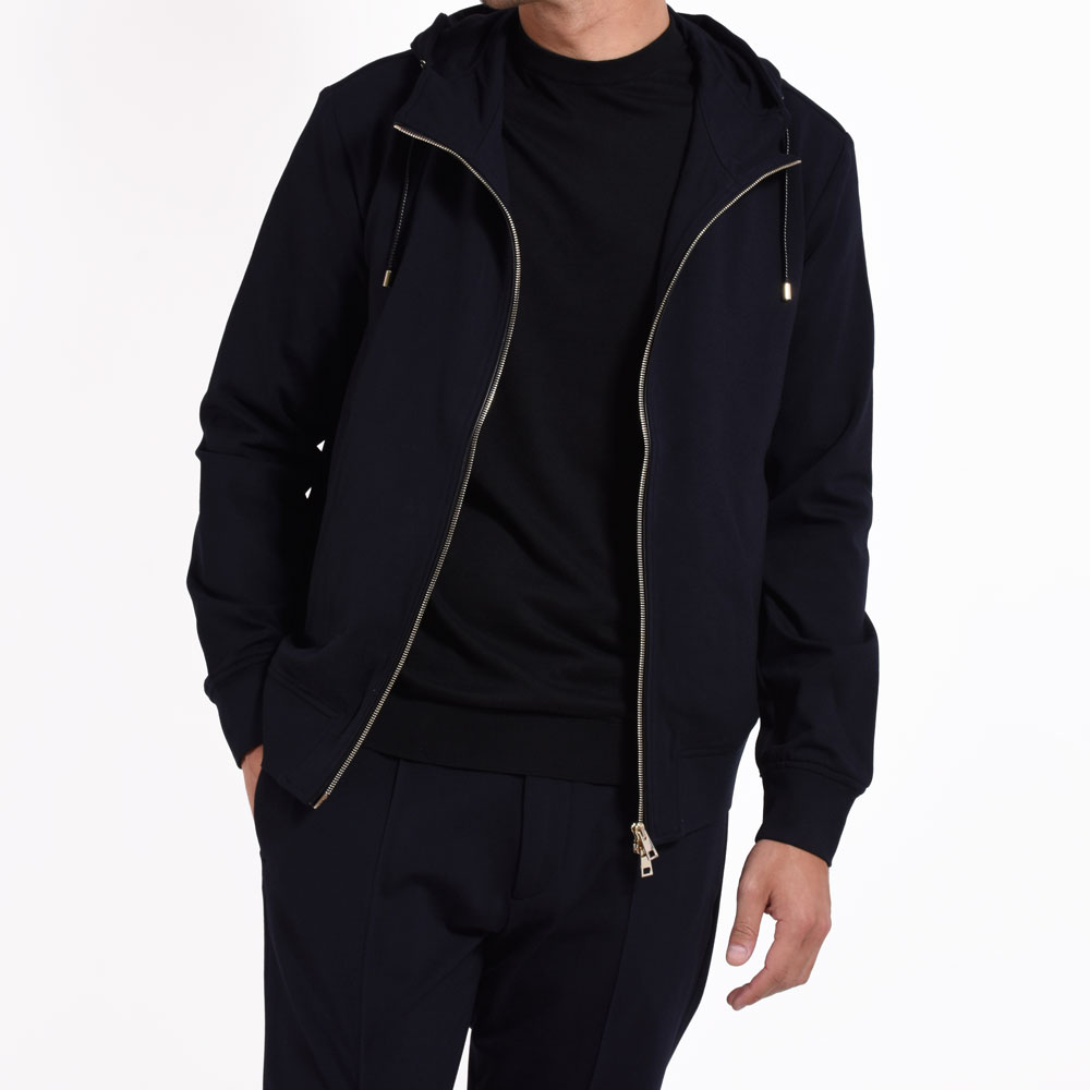 ・イタリアブランドらしくシルエットは実にスマート。フード部分には台が付くことで立ち上がりが適度にあり、ジップを上まで留めた際にアゴまでカバーするのがアメリカブランドなどのパーカーとの違いです。洗練されたシルエットとシンプルなデザインが特徴。
