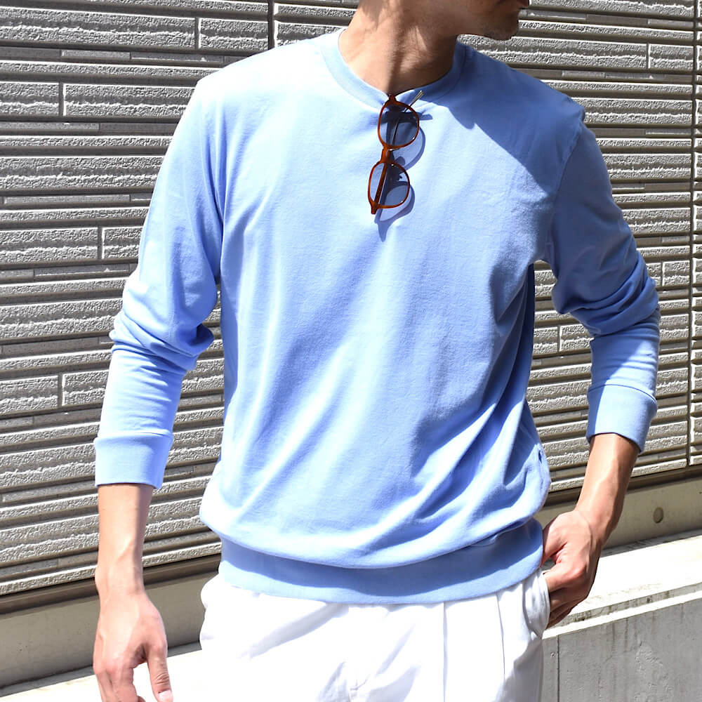・ご自宅での着用はもちろんのこと、そのまま外出しても見映えは十分。また、ジャケットやブルゾンのインナーにもピッタリ!長袖なので袖裏地が肌に触れることがなく、リブ付きなので袖や裾がジャケットやブルゾンから出過ぎてしまうということもありません。もちろんカットソーなのでイージーケアです。クルーネックの他、Vネックとタートルネックもご用意しました。
