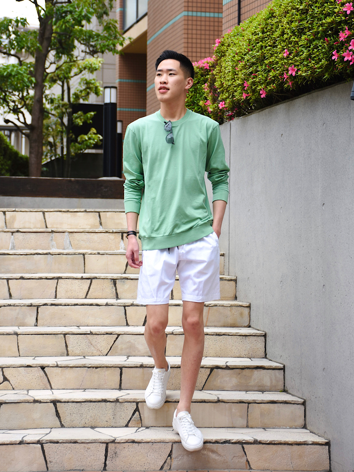 ・パステルグリーンを着用し、白のちょいワイドのショーツを合わせたスタイル