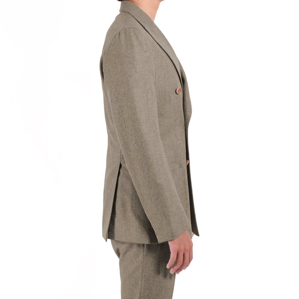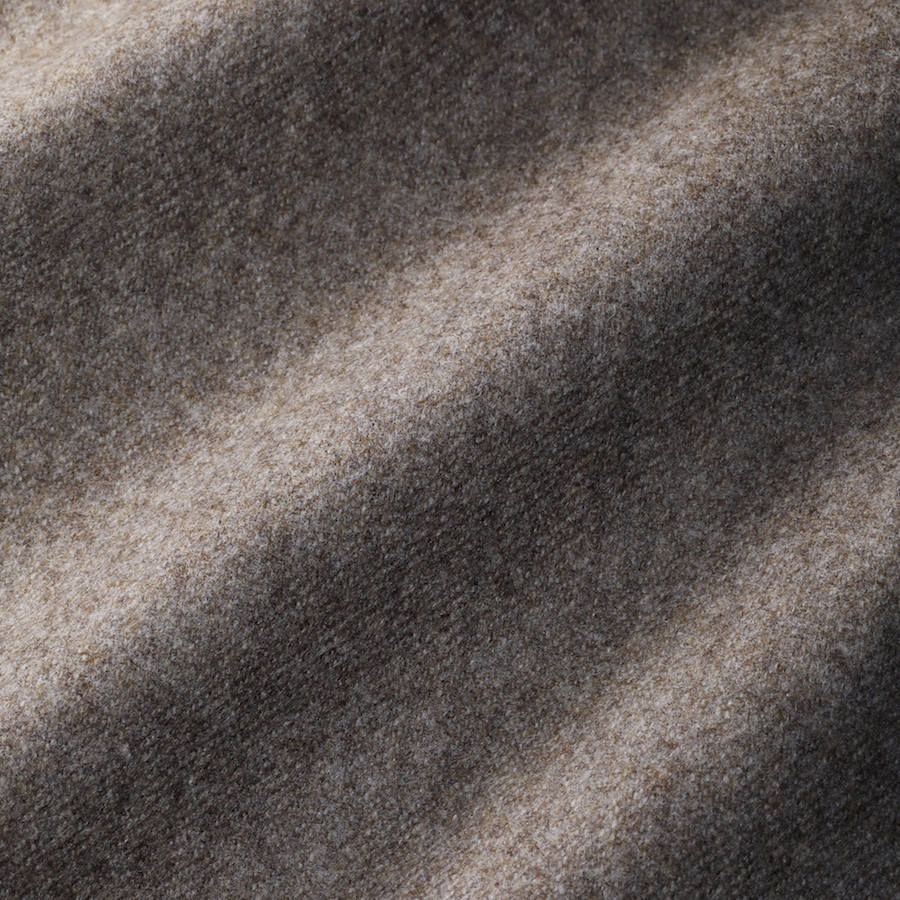 ・目付けは340グラムと重すぎず、フランネル特有の重厚感は色合いと相まって感じさせません。トーンオントーンで纏められたボタンやライニングも上品さを醸します。