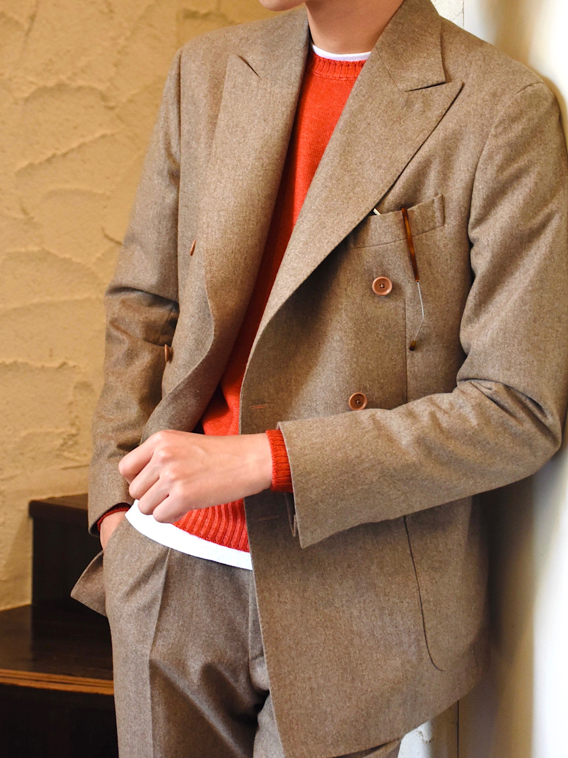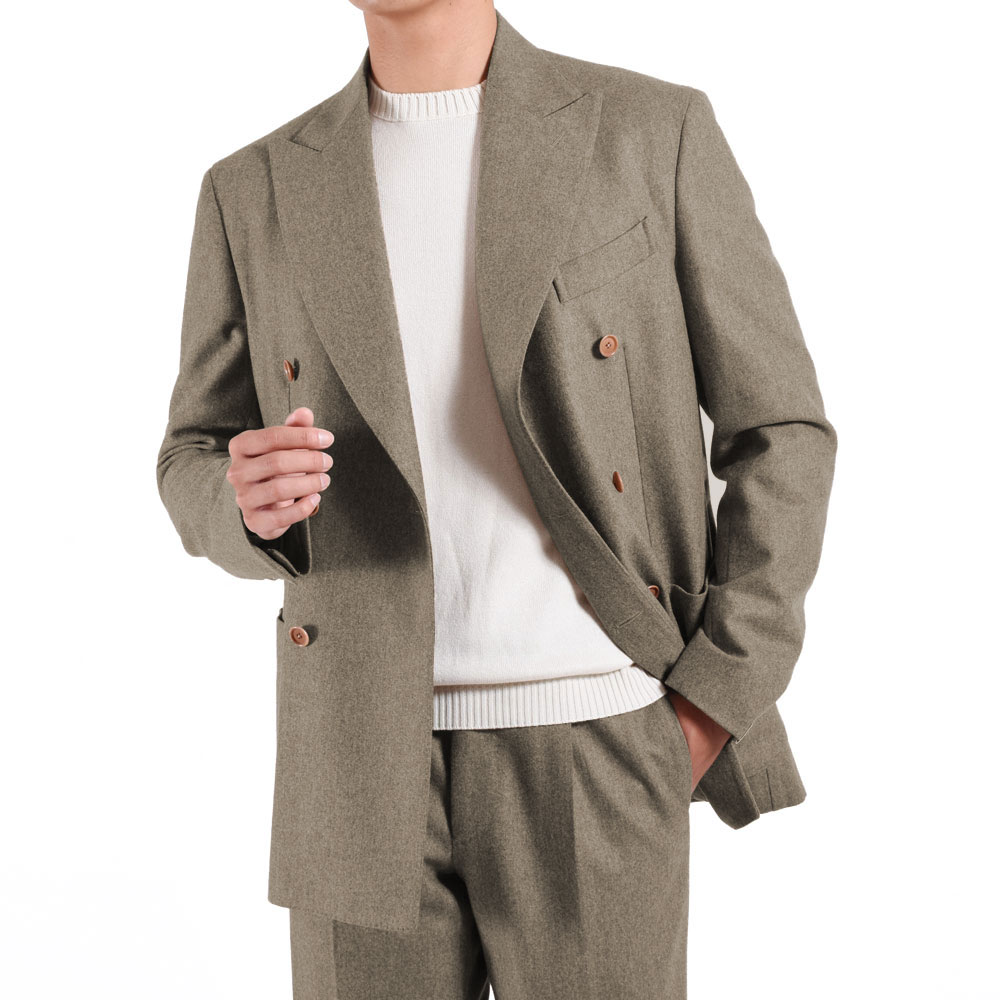 ・BRが得意とする品のあるベージュフランネルのスーツをダブルブレステッドでご用意しました!元来はスポーティな生地であるフランネルが、ベージュという色合いと優雅さのあるダブルになることで一気にラグジュアリー領域へ突入する一着です。