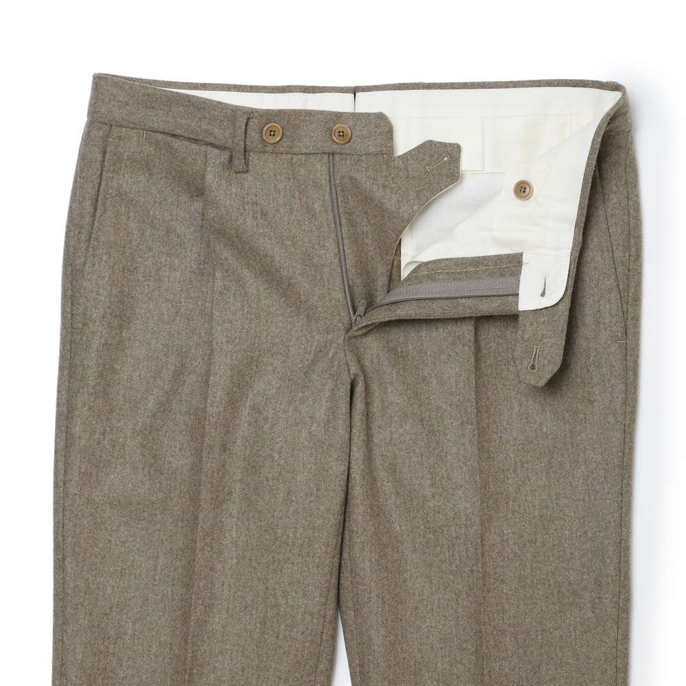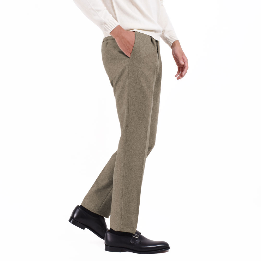 ・パンツは1プリーツモデルをセレクト。適度な股上で腰廻りを包み込み、緩やかなテーパードラインで穿く人をエレガントにバランス良く見せてくれるシルエットです。