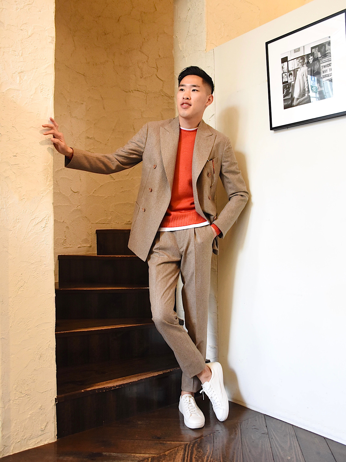個人的にはラグカジスタイルとして着用したいこちらのスーツ。インナーにはクルーネックニットに白Tチラ見せ、足元はスニーカーですね!ジャケットはダブルブレステッドでありながら、フランネル生地且つパッチポケット仕様なので、絶妙なカジュアルダウンがハマるスーツなのです!柔らかなフランネル生地は、季節感あり、ベージュという色味が上品且つ洒落て見えるでしょう!ちなみに、ジャケット単品使いも◎