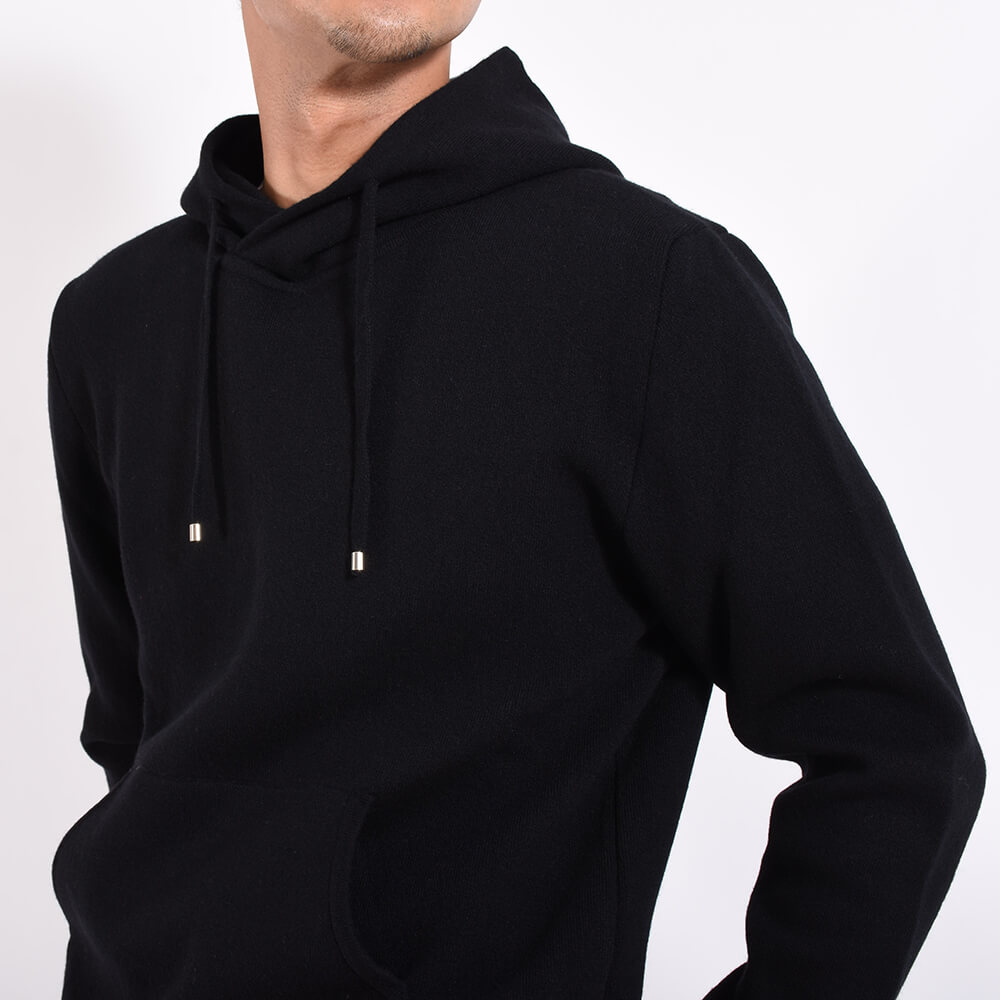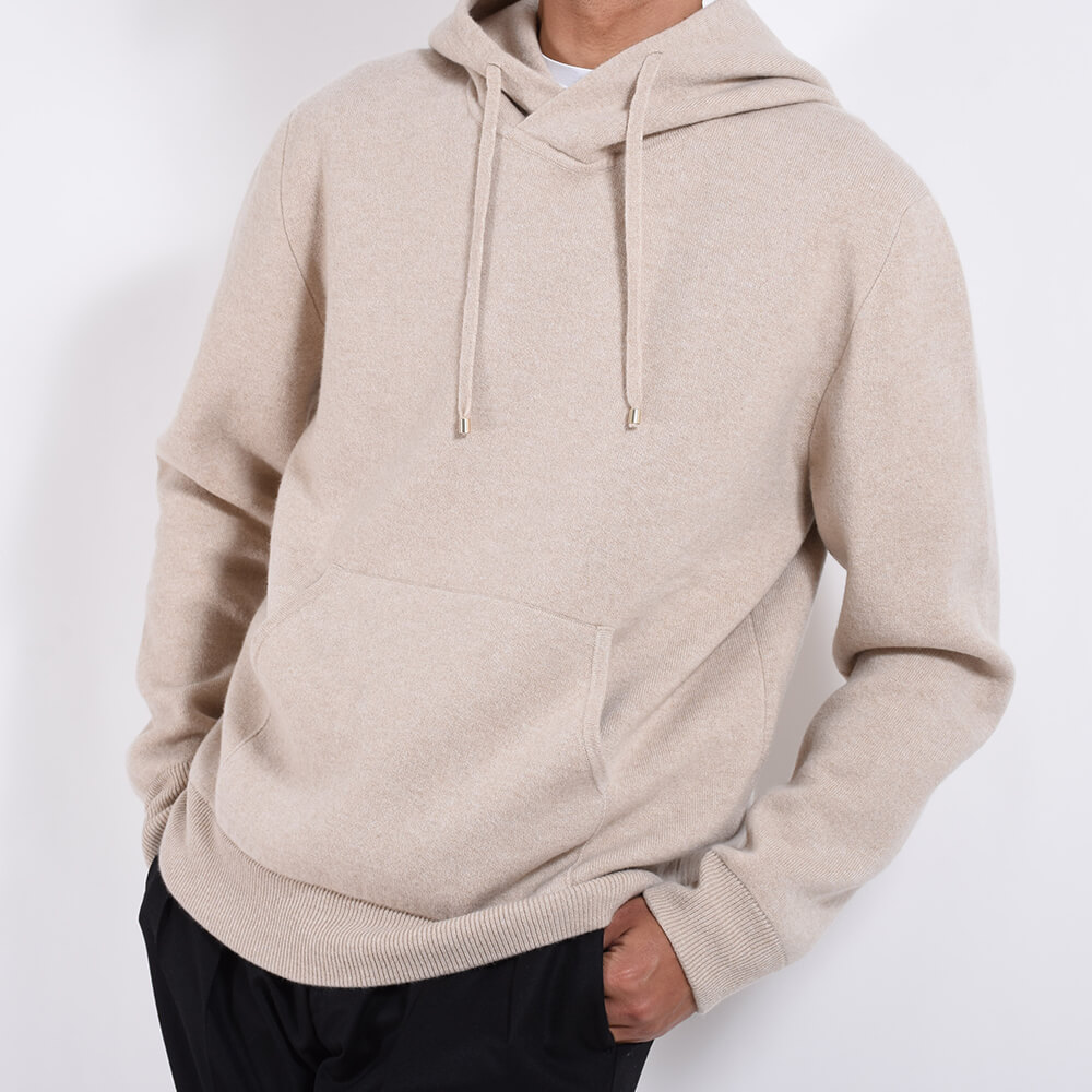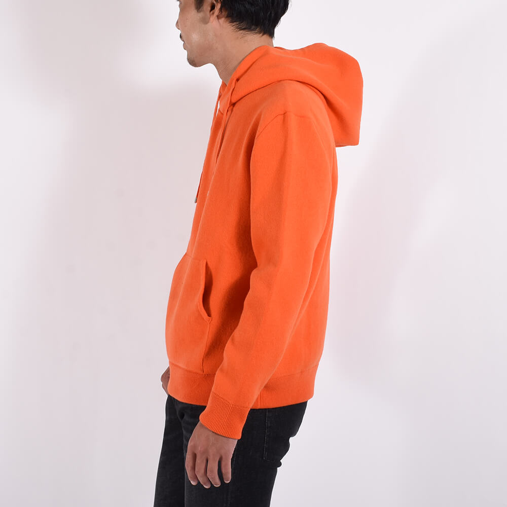 ・カシミアニットらしさを出しながら、ほどよくゆったりとしたシルエット、フードのボリューム感を実現するためには肉感のある編み地が必要、ということで新しく編み地を開発。スムース編みを採用し、肉感と伸縮性を両立。さらに編み上げた後に適度な洗い加工を施すことでカシミアらしいフワッとした質感も出しました。