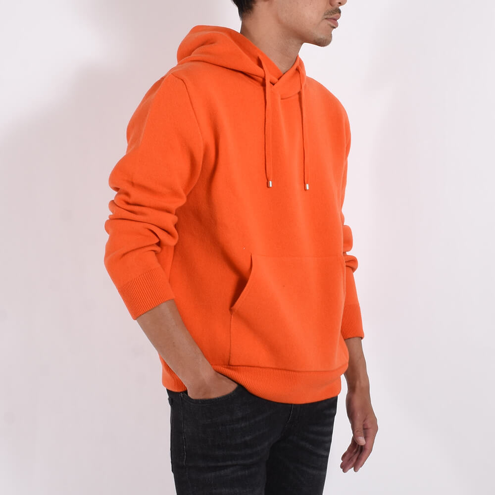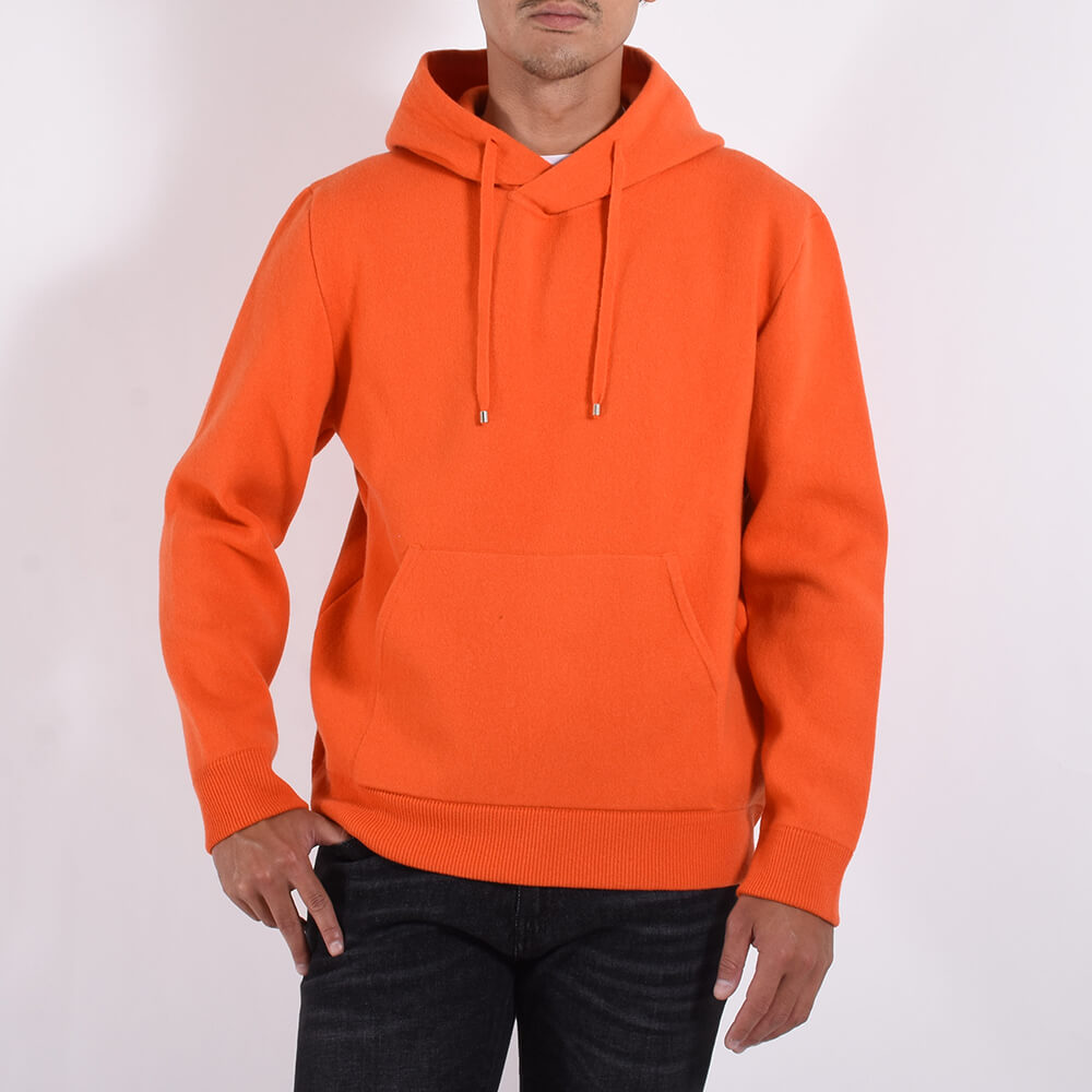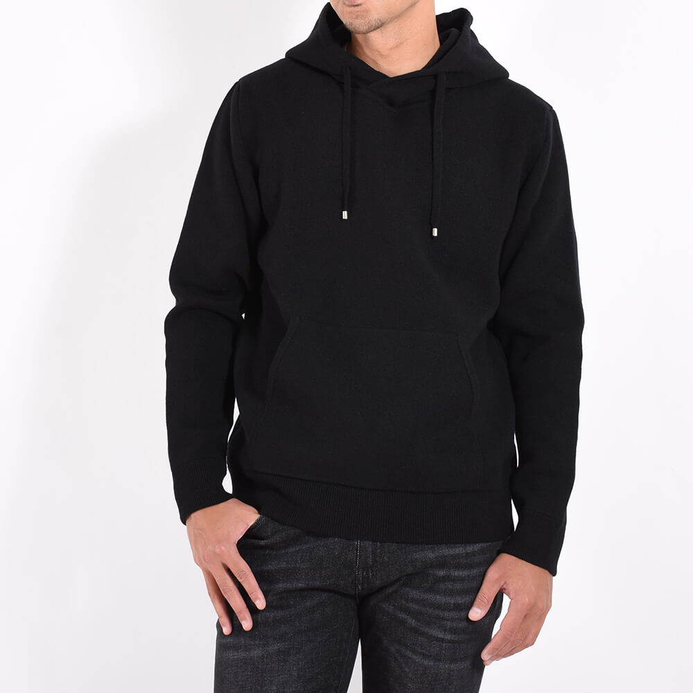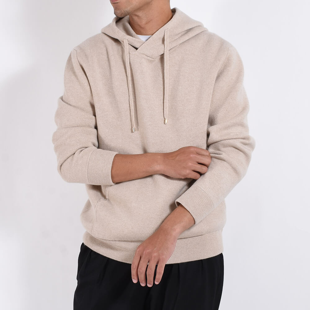 ・カシミアニットらしさを出しながら、ほどよくゆったりとしたシルエット、フードのボリューム感を実現するためには肉感のある編み地が必要、ということで新しく編み地を開発。スムース編みを採用し、肉感と伸縮性を両立。さらに編み上げた後に適度な洗い加工を施すことでカシミアらしいフワッとした質感も出しました。