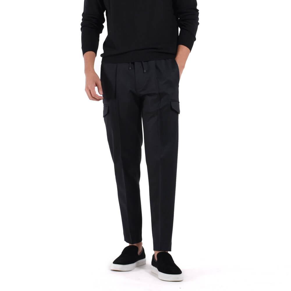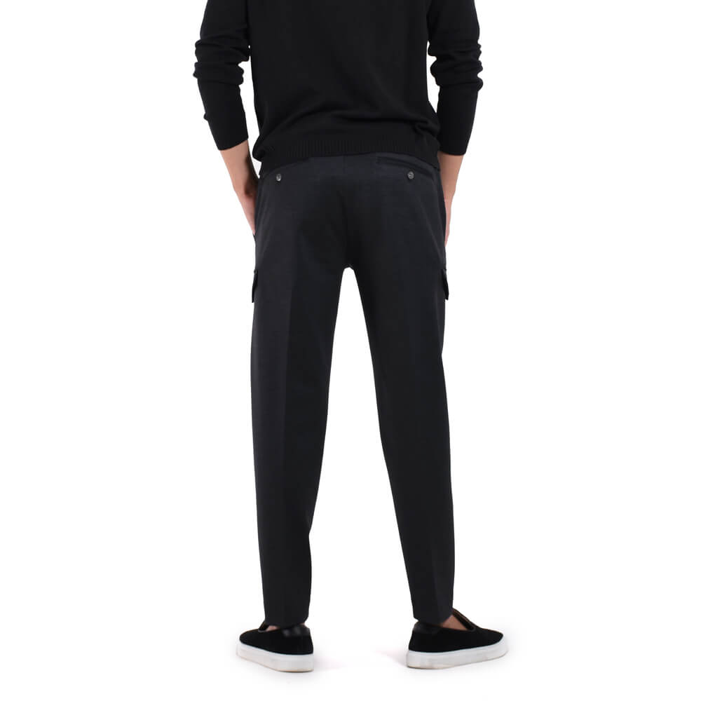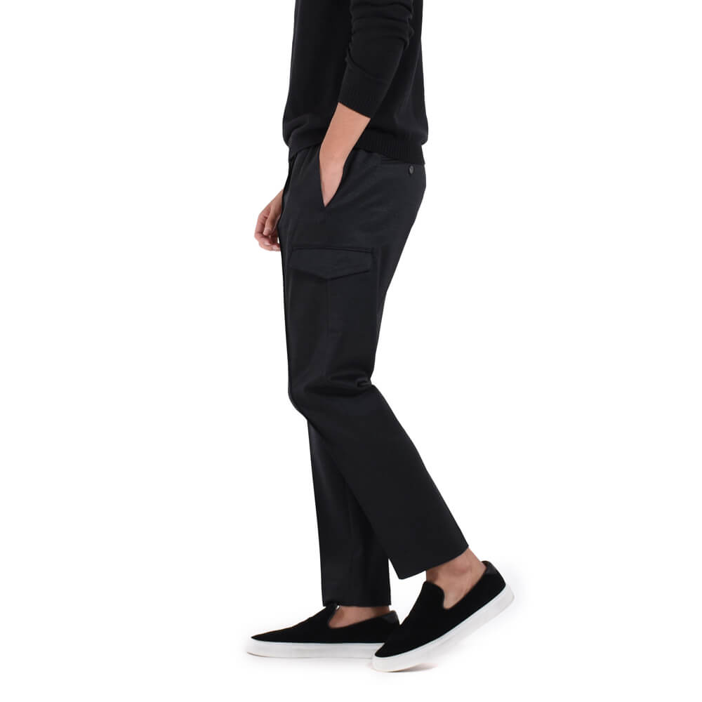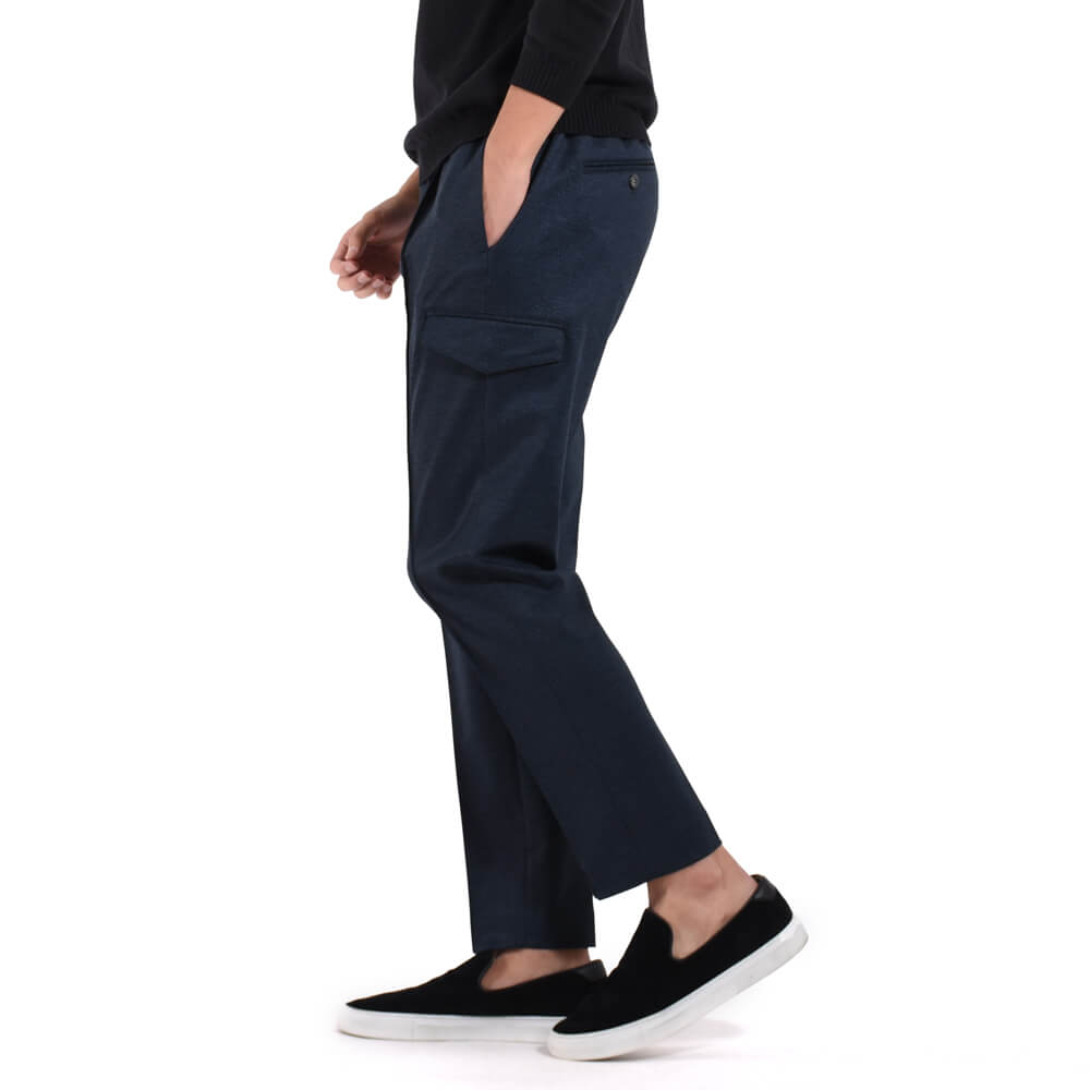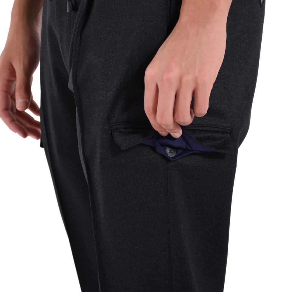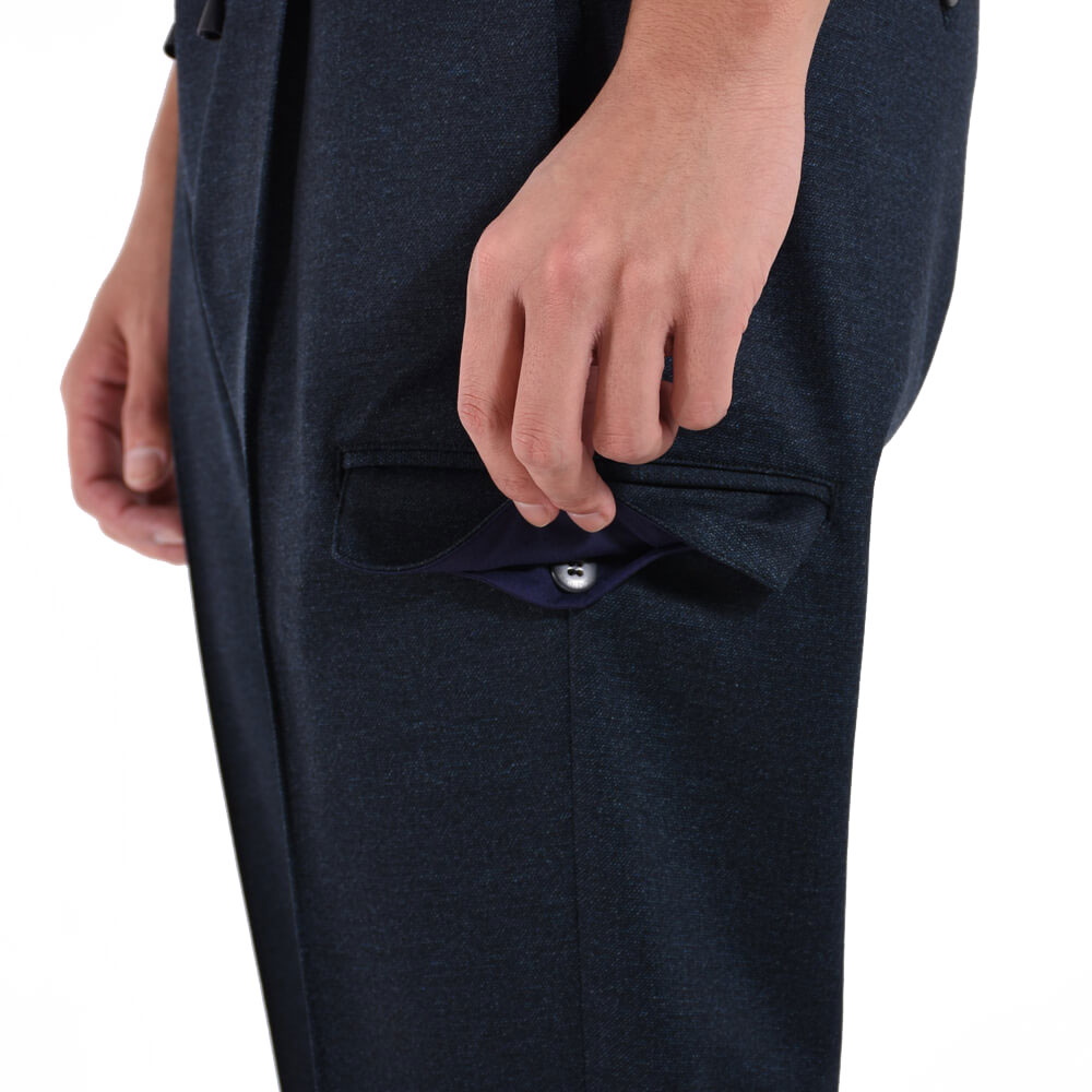 ・カーゴパンツのデザインを取り入れ、サイドポケット付き。パッチではなく内袋付きフラップポケットなのでスッキリとしたシルエットを実現。さらに高めの位置に取り付けられているのでスマートに映ります。