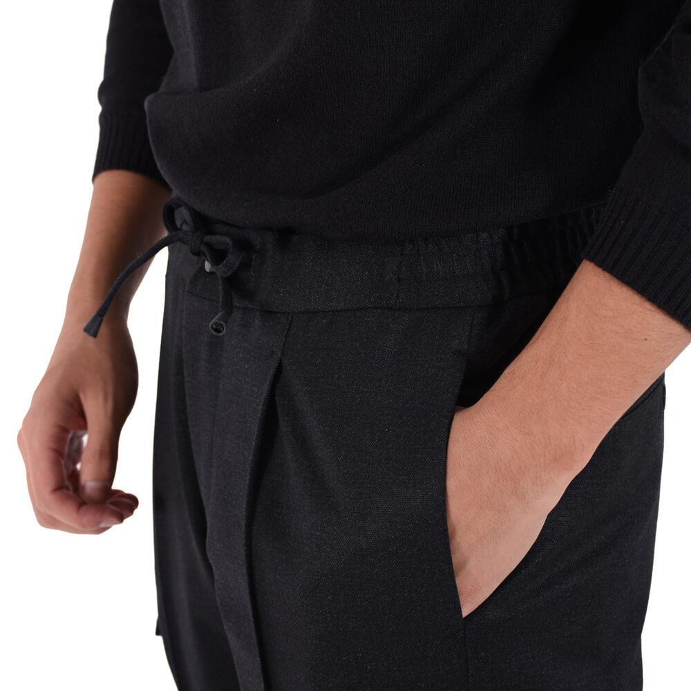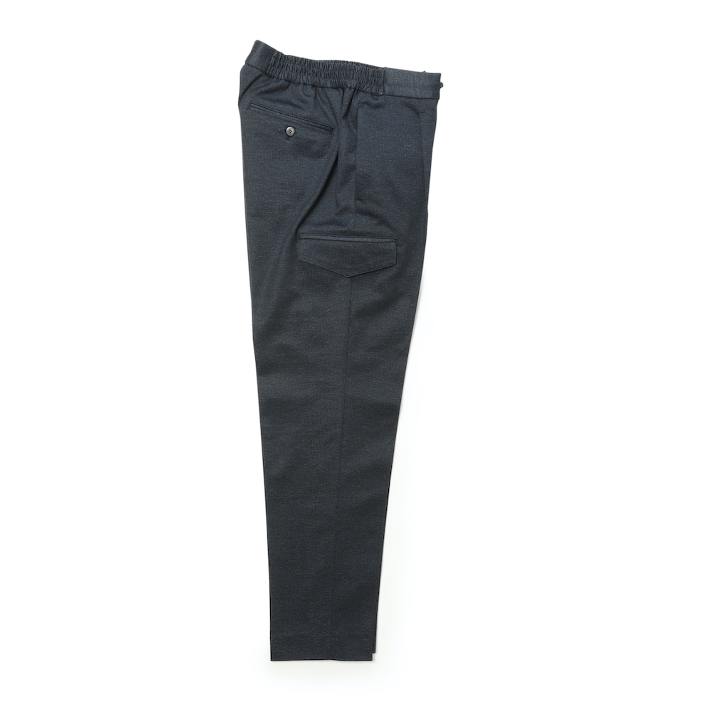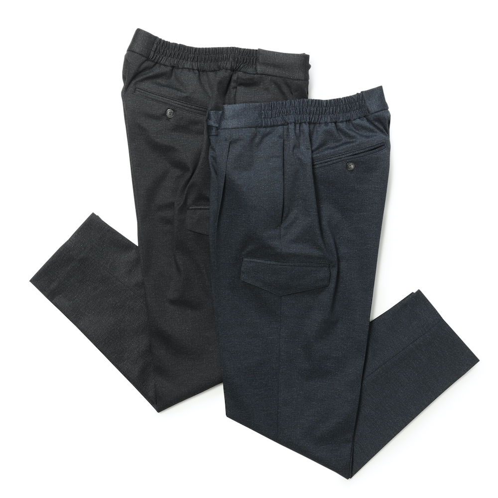 ・"TIZIANO(ティッツィアーノ)"は、1プリーツでウエスト部分はほぼフルシャーリングのドローコード付き。普通であればカジュアルに見え過ぎてしまうデザインを「giabsarchivio(ジャブスアルキヴィオ)」ならではの絶妙なユルさと膝上からのシャープなテーパードシルエットによって品良く見せています。