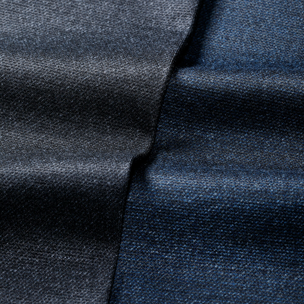 ・生地は微光沢があることで高級感を醸すメランジのジャージーファブリック。どことなくドレッシーな見た目とは裏腹に高い伸縮性があり、しっかりと編まれているためキックバックに優れています。