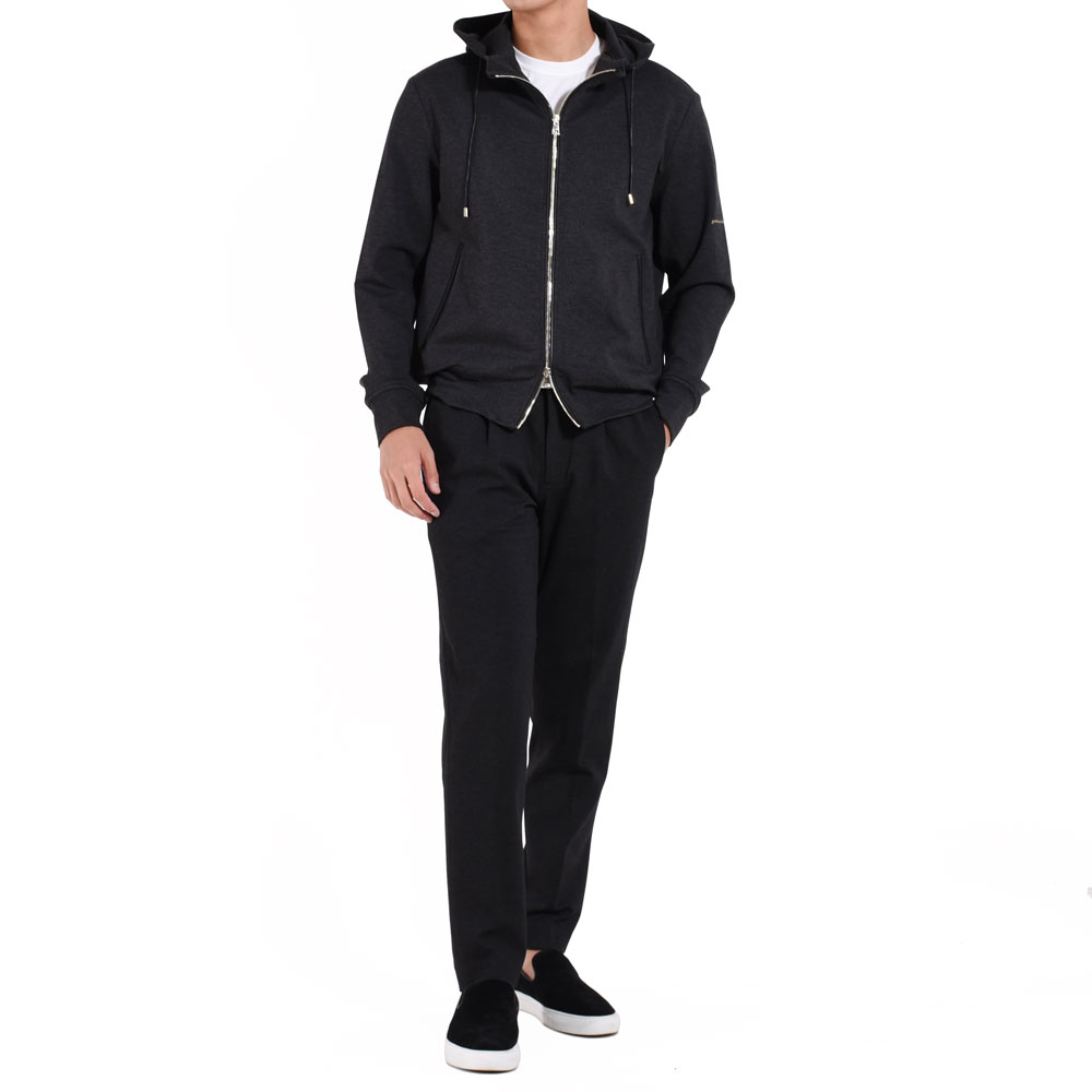 ・イタリアブランドらしくシルエットは実にスマート。首周りには台が付くことでフードの立ち上がりが適度にあり、ジップを上まで留めた際に首元をカバーするのがアメリカブランドなどのパーカーとの違いです。洗練されたシルエットとシンプルなデザインが特徴。