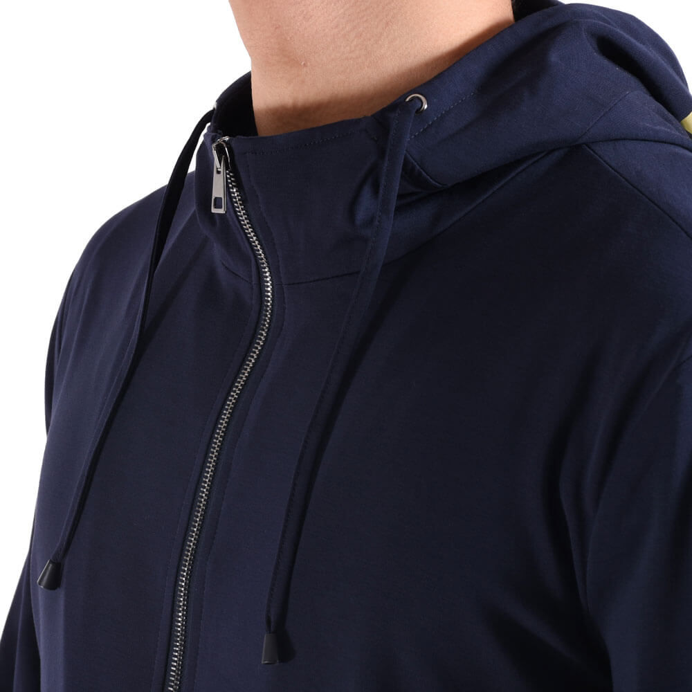 ・首周りには台が付くことでフードの立ち上がりが適度にあり、ジップを上まで留めた際に首元をカバーするのがアメリカブランドなどのパーカーとの違いです。洗練されたシルエットとシンプルなデザインが特徴。