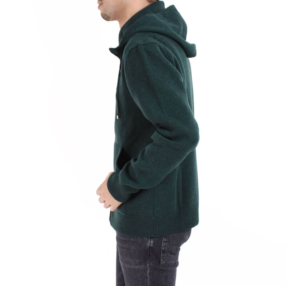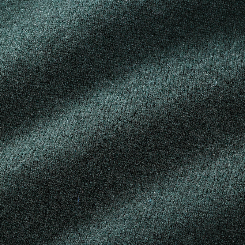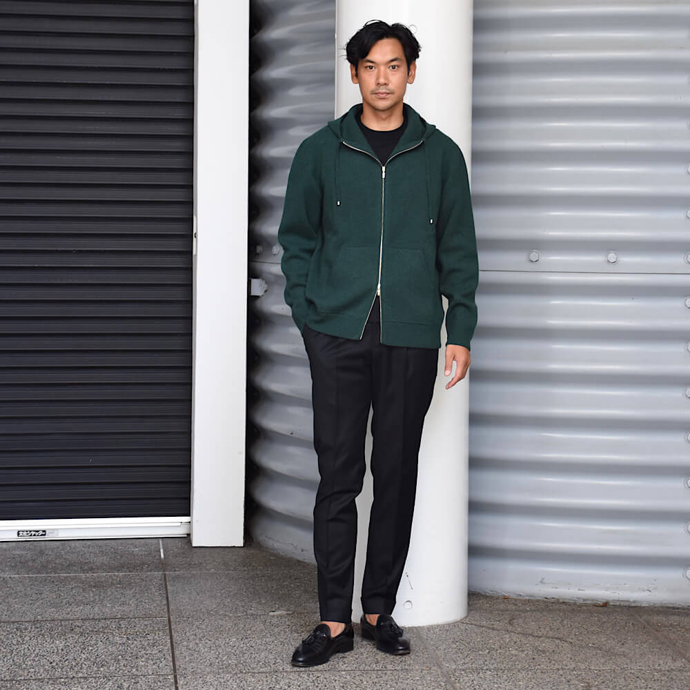 ・カシミアニットらしさを出しながら、アメリカ物のスウェットパーカーのようなほどよくゆったりとしたシルエット、フードのボリューム感を実現するためスムース編みを採用し、肉感と伸縮性を両立。さらに編み上げた後に適度な洗い加工を施すことでカシミアならではのフワッとした柔らかな質感も出しています。