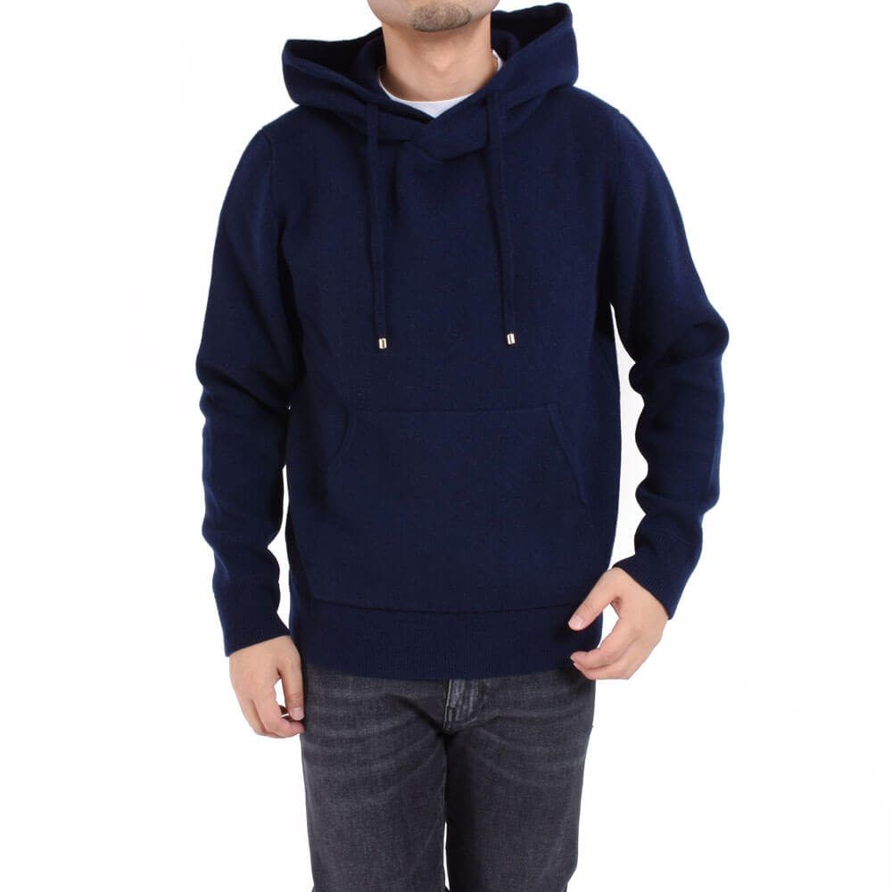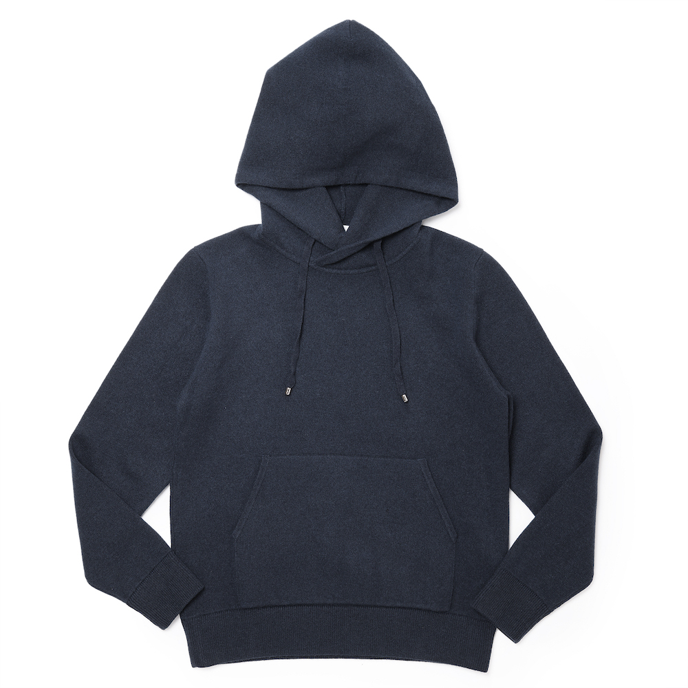 ・カシミアニットらしさを出しながら、ほどよくゆったりとしたシルエット、フードのボリューム感を実現するためスムース編みを採用し、肉感と伸縮性を両立。さらに編み上げた後に適度な洗い加工を施すことでカシミアらしいフワッとした質感も出しました。