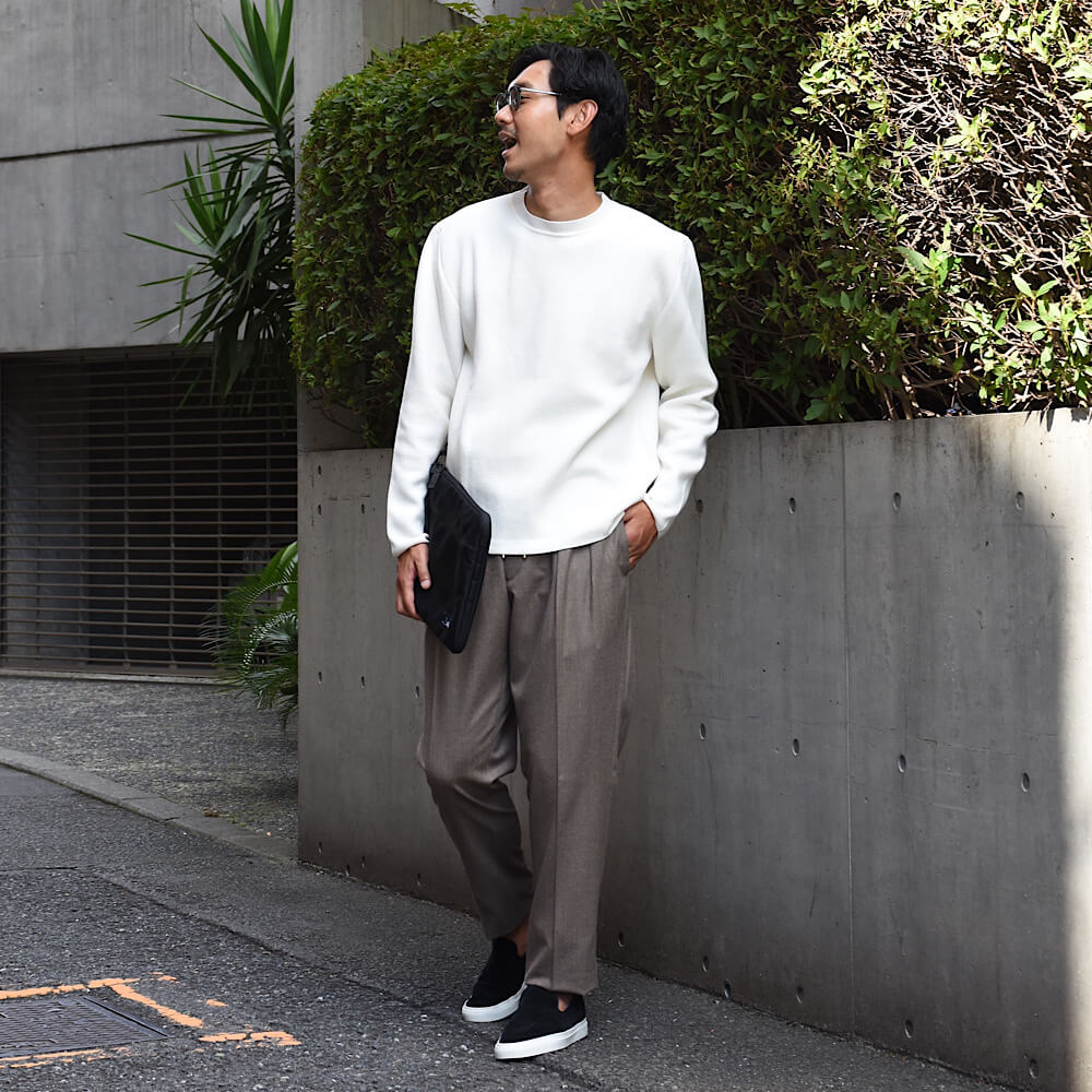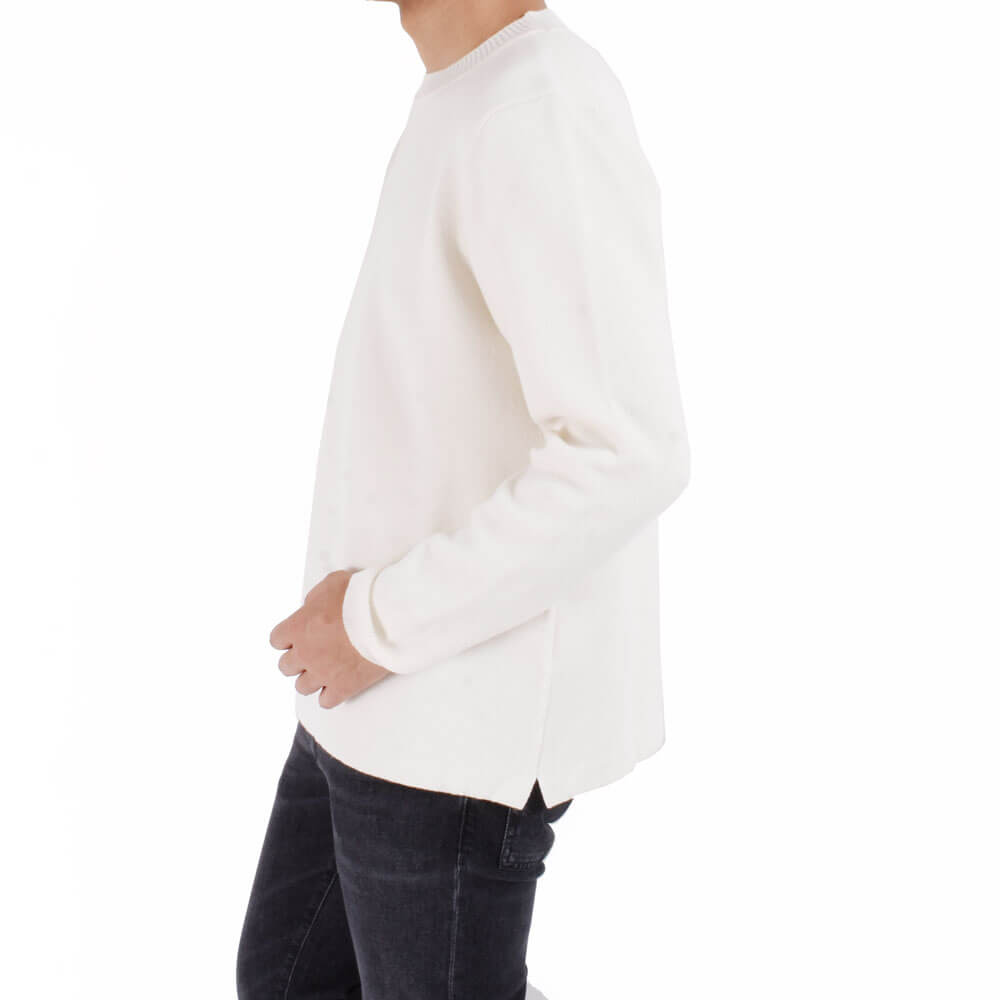 ・ポイントはディテールにもあります。同じ編み地のパーカーシリーズとは異なり袖とネックのリブを二重ではなく一重(シングル)にして、フードが無い分スッキリ目に。また、レイヤードしやすいように裾にはリブを付けず、カットソーのような始末にし、サイドスリットを入れて軽快さを加えました。